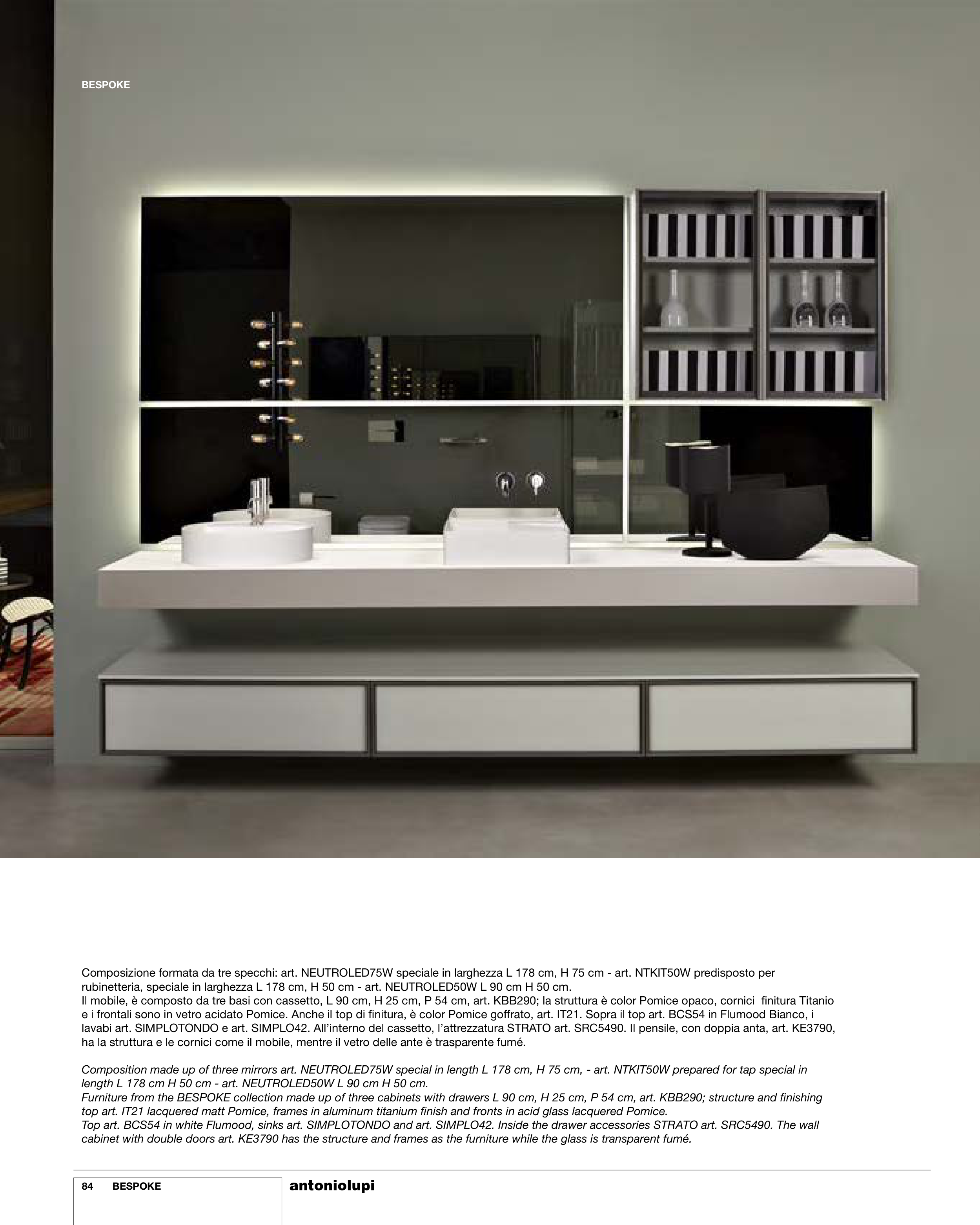 top art. IT21 lacquered matt Pomice, frames in aluminum titanium finish and fronts in acid glass lacquered Pomice.