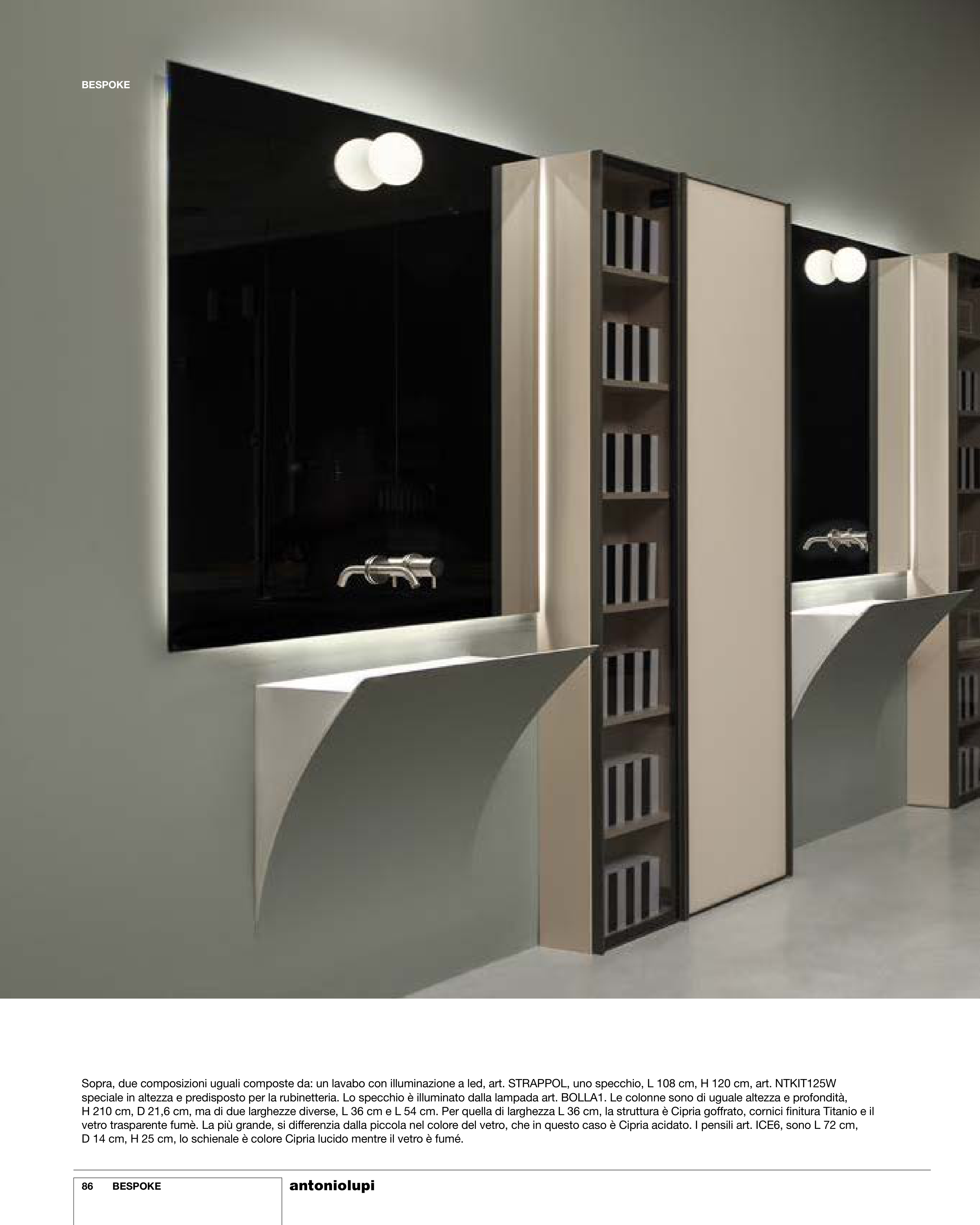 speciale in altezza e predisposto per la rubinetteria. Lo specchio è illuminato dalla lampada art. BOLLA1. Le colonne sono di uguale altezza e profondità,