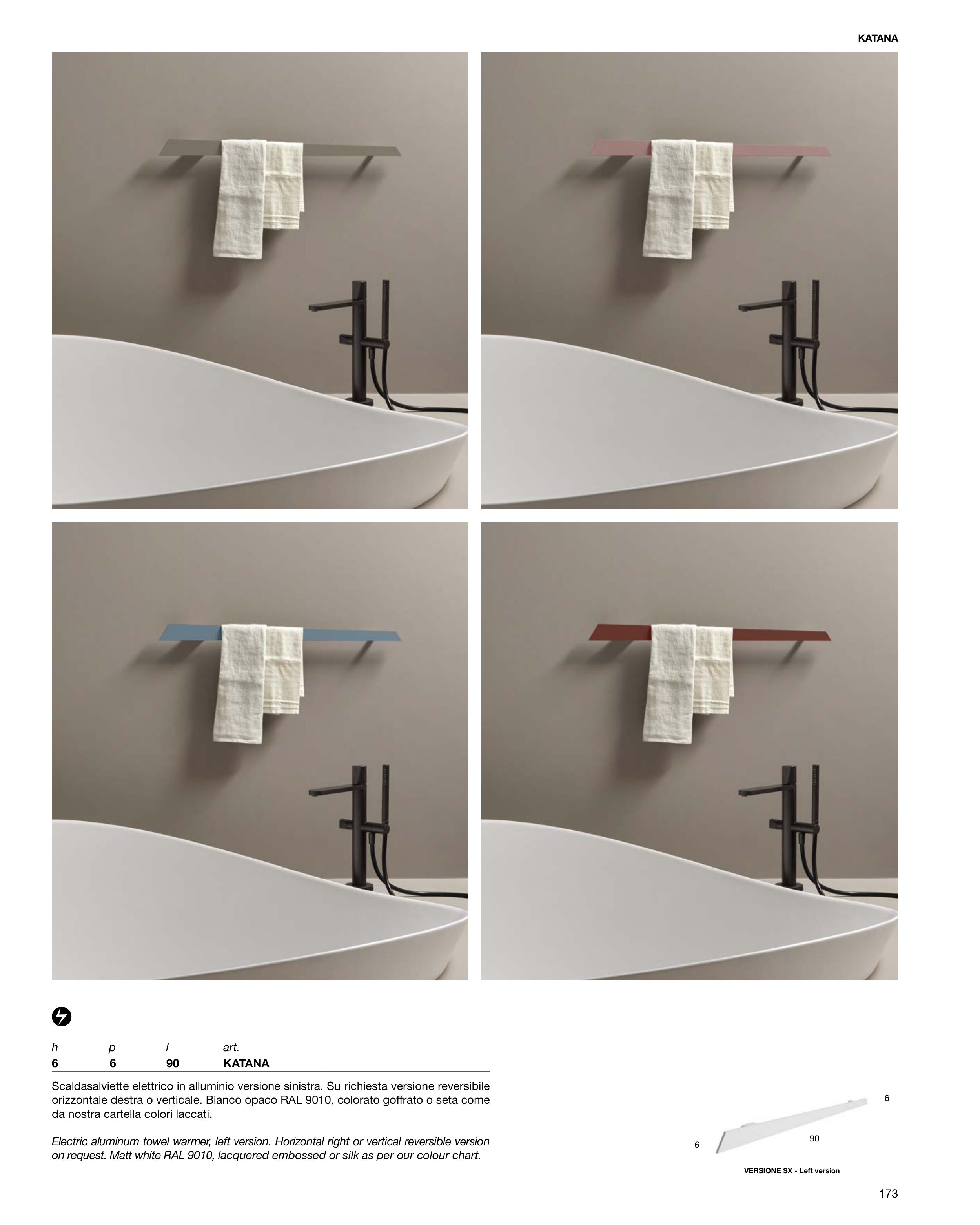 Electric aluminum towel warmer, left version. Horizontal right or vertical reversible version