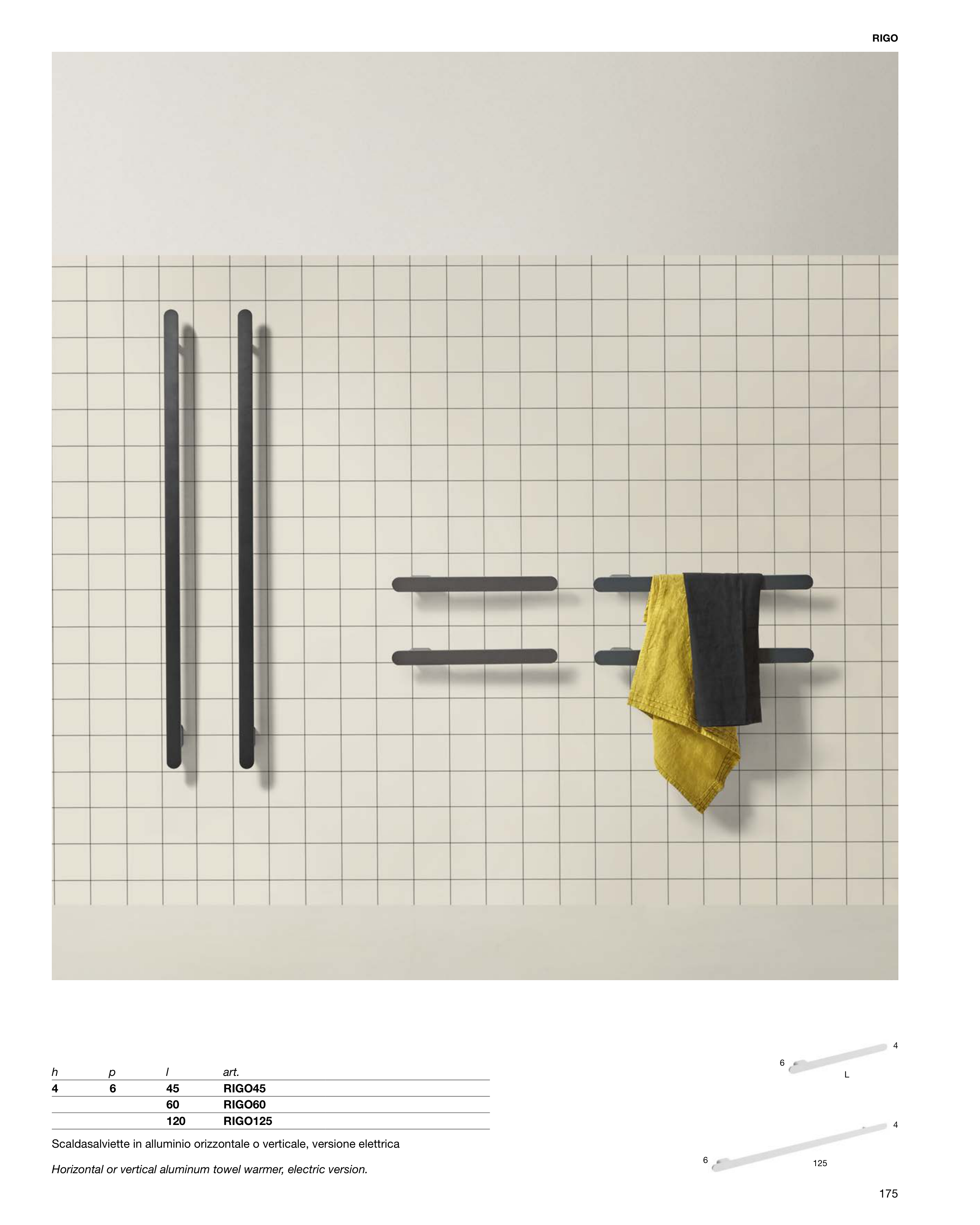 175 RIGO h p l art. 4 6 45 RIGO45 60 RIGO60 120 RIGO125 Scaldasalviette in alluminio orizzontale o verticale, versione elettrica Horizontal or vertical aluminum towel warmer, electric version. L 125 4 4 6 6