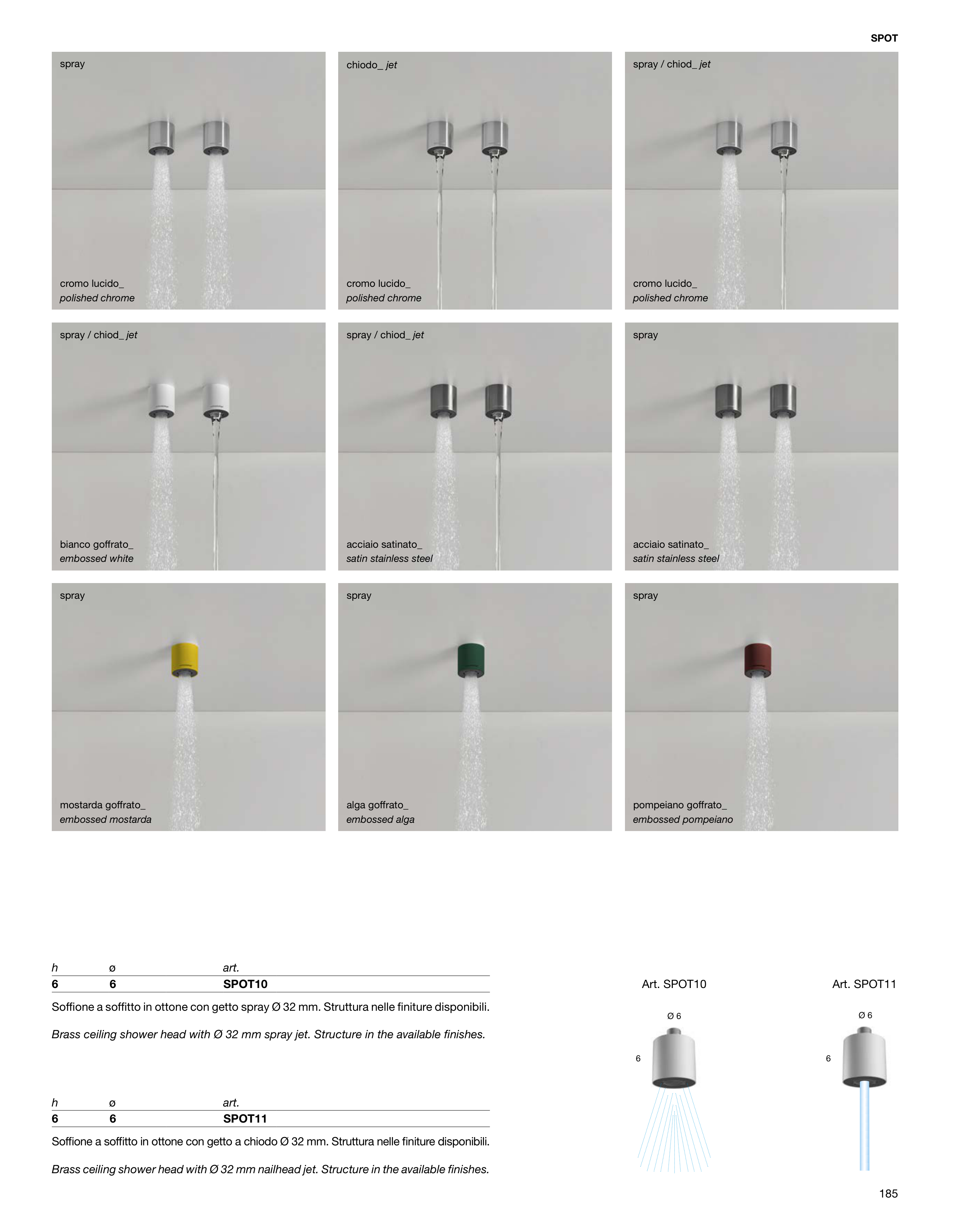 Brass ceiling shower head with Ø 32 mm nailhead jet. Structure in the available finishes.