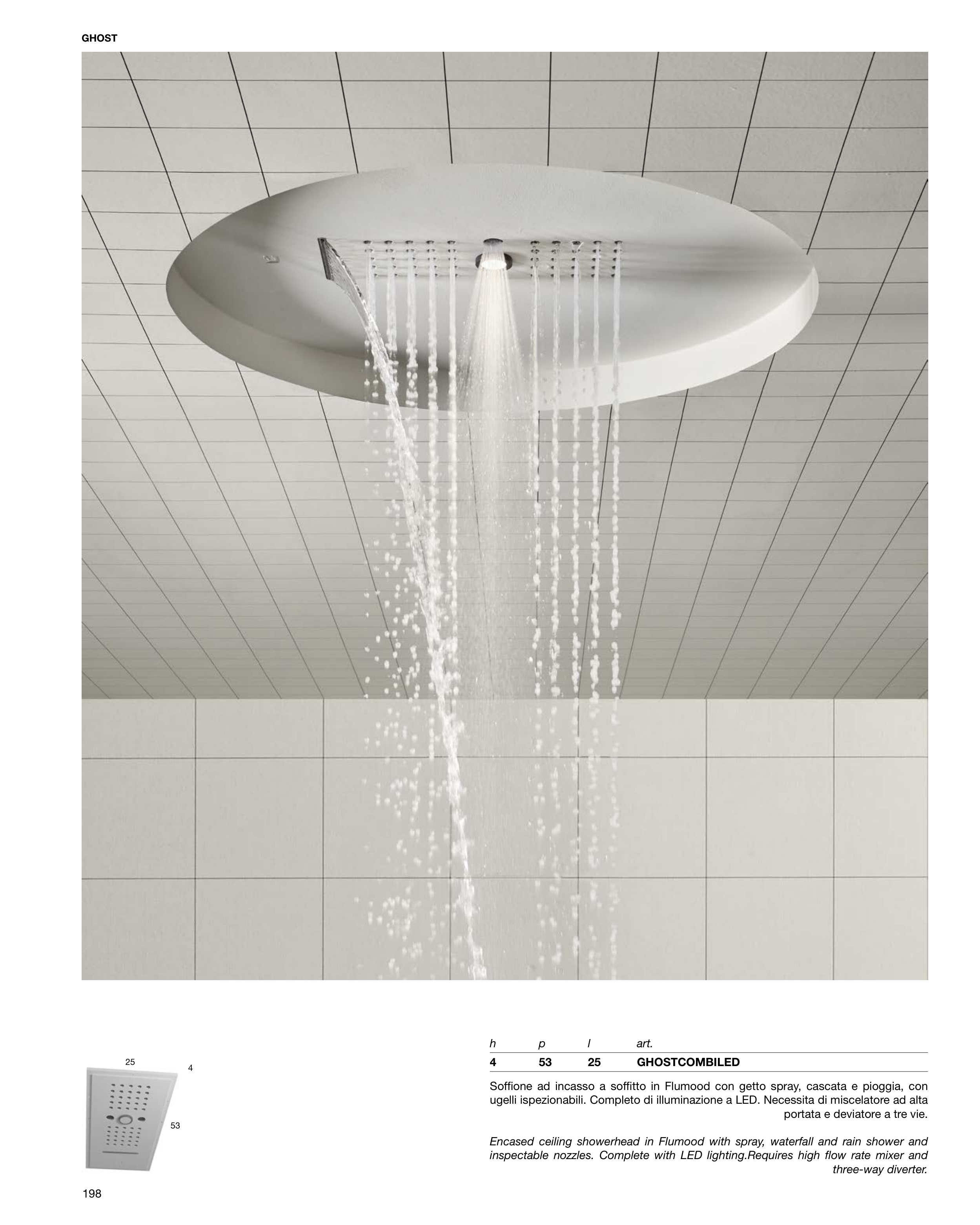 Encased ceiling showerhead in Flumood with spray, waterfall and rain shower and