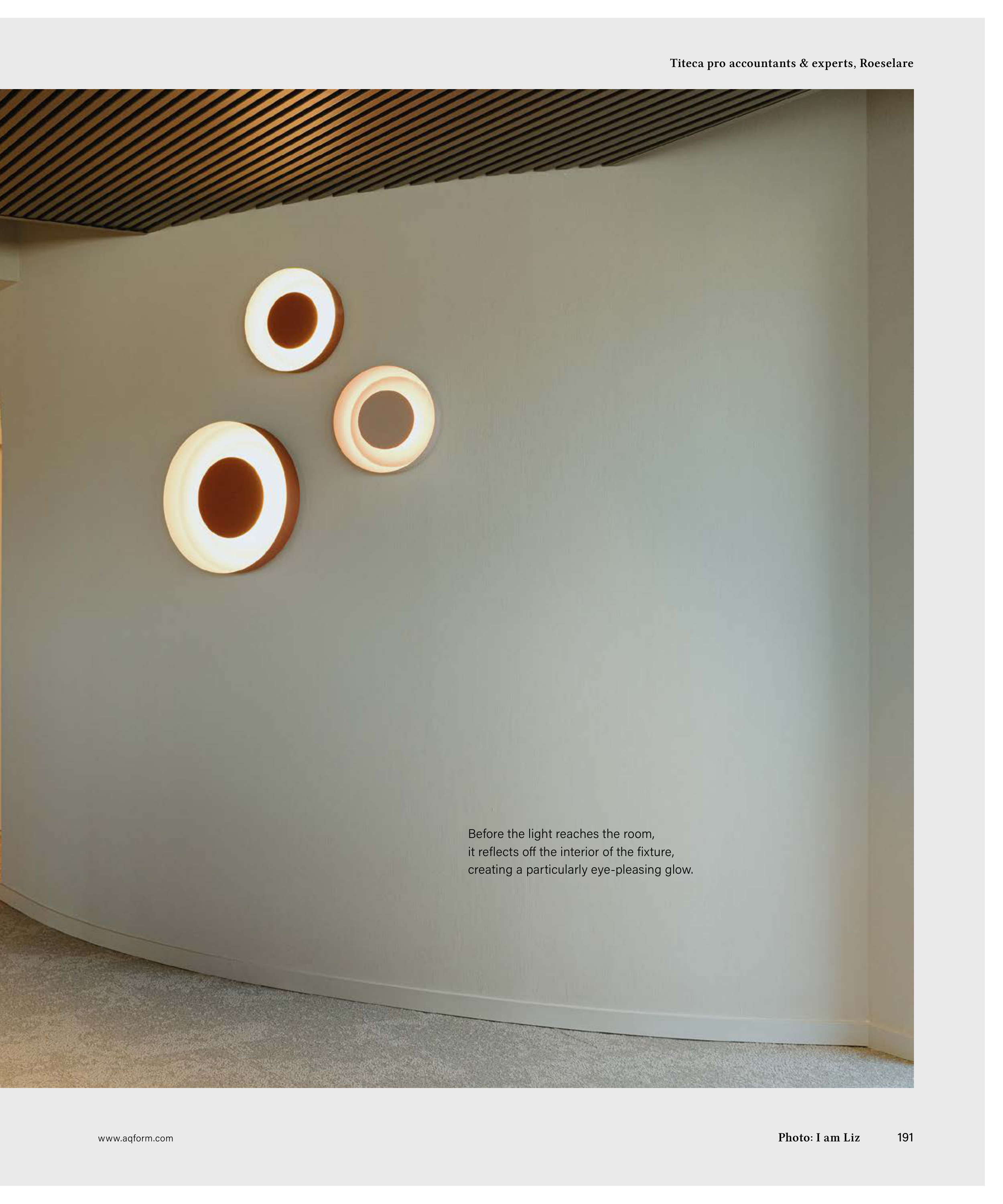 Titeca pro accountants & experts, Roeselare Photo: I am Liz Before the light reaches the room, it reflects off the interior of the fixture, creating a particularly eye-pleasing glow. www.aqform.com 191