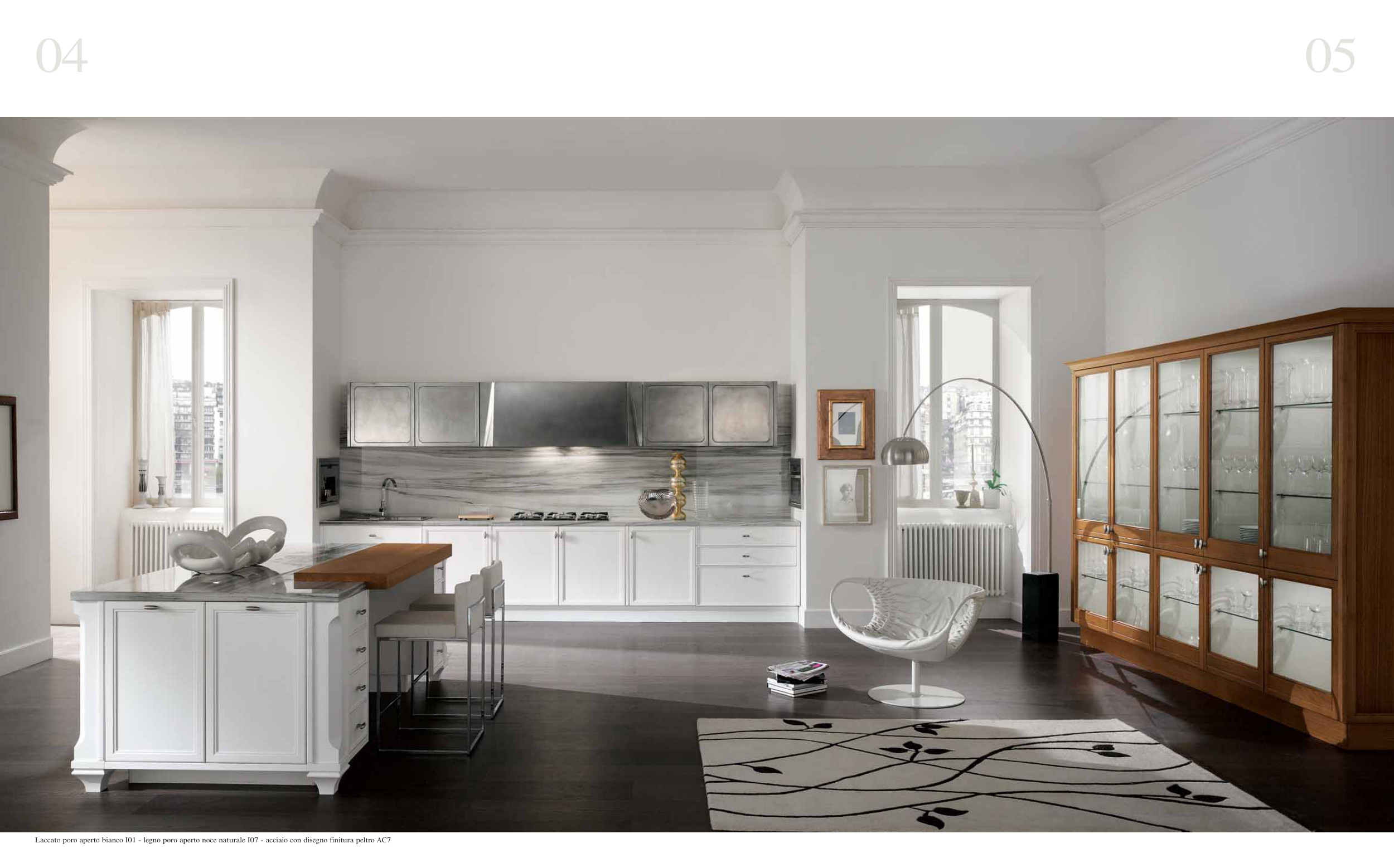 Laccato poro aperto bianco I01 - legno poro aperto noce naturale I07 - acciaio con disegno finitura peltro AC7