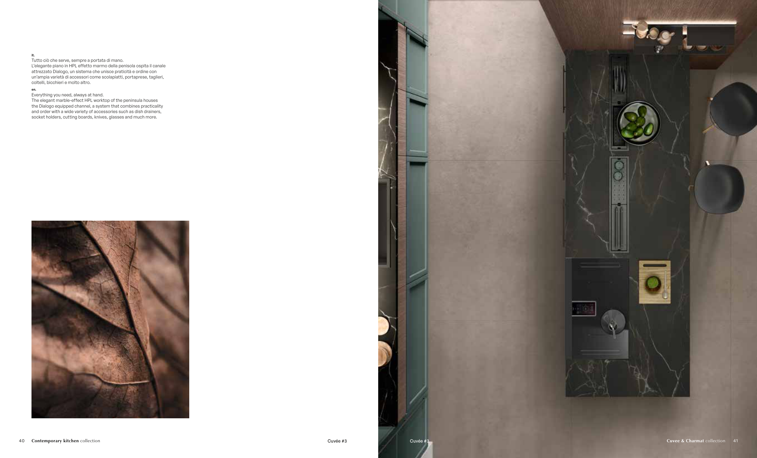 The elegant marble-effect HPL worktop of the peninsula houses