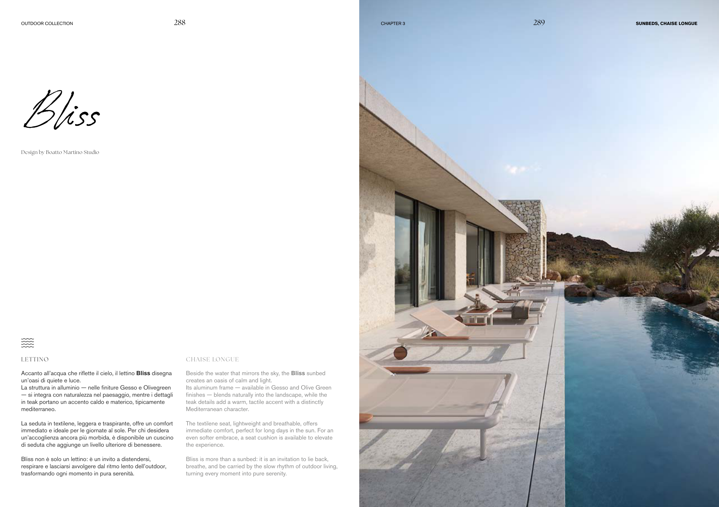 Accanto all’acqua che riflette il cielo, il lettino Bliss disegna