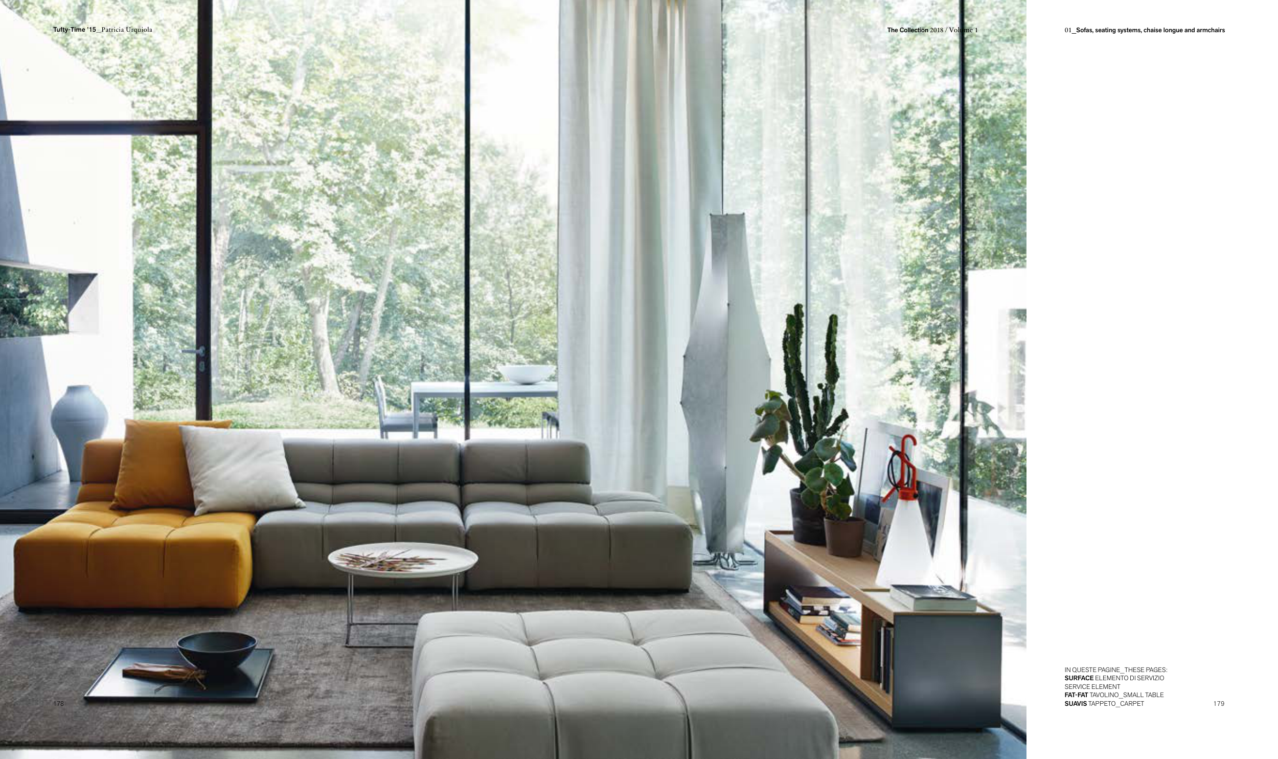 IN QUESTE PAGINE_THESE PAGES: SURFACE ELEMENTO DI SERVIZIO SERVICE ELEMENT FAT-FAT TAVOLINO_SMALL TABLE SUAVIS TAPPETO_CARPET 178 The Collection 2018 / Volume 1 01_Sofas, seating systems, chaise longue and armchairs 179 Tufty-Time ’15_Patricia Urquiola