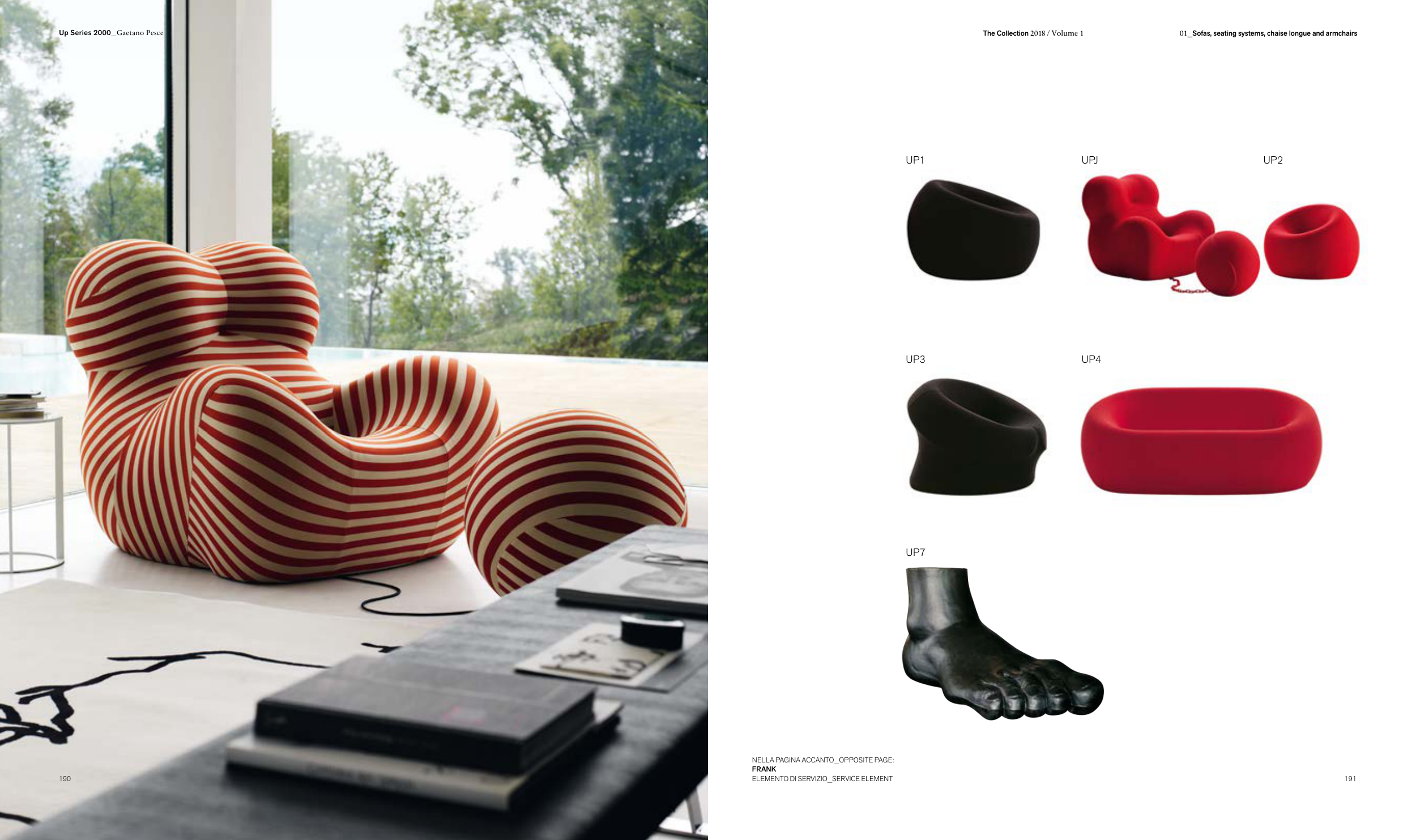 UP2 UP3 UP1 UP4 UP7 UPJ NELLA PAGINA ACCANTO_OPPOSITE PAGE: FRANK ELEMENTO DI SERVIZIO_SERVICE ELEMENT 190 The Collection 2018 / Volume 1 01_Sofas, seating systems, chaise longue and armchairs 191 Up Series 2000_Gaetano Pesce
