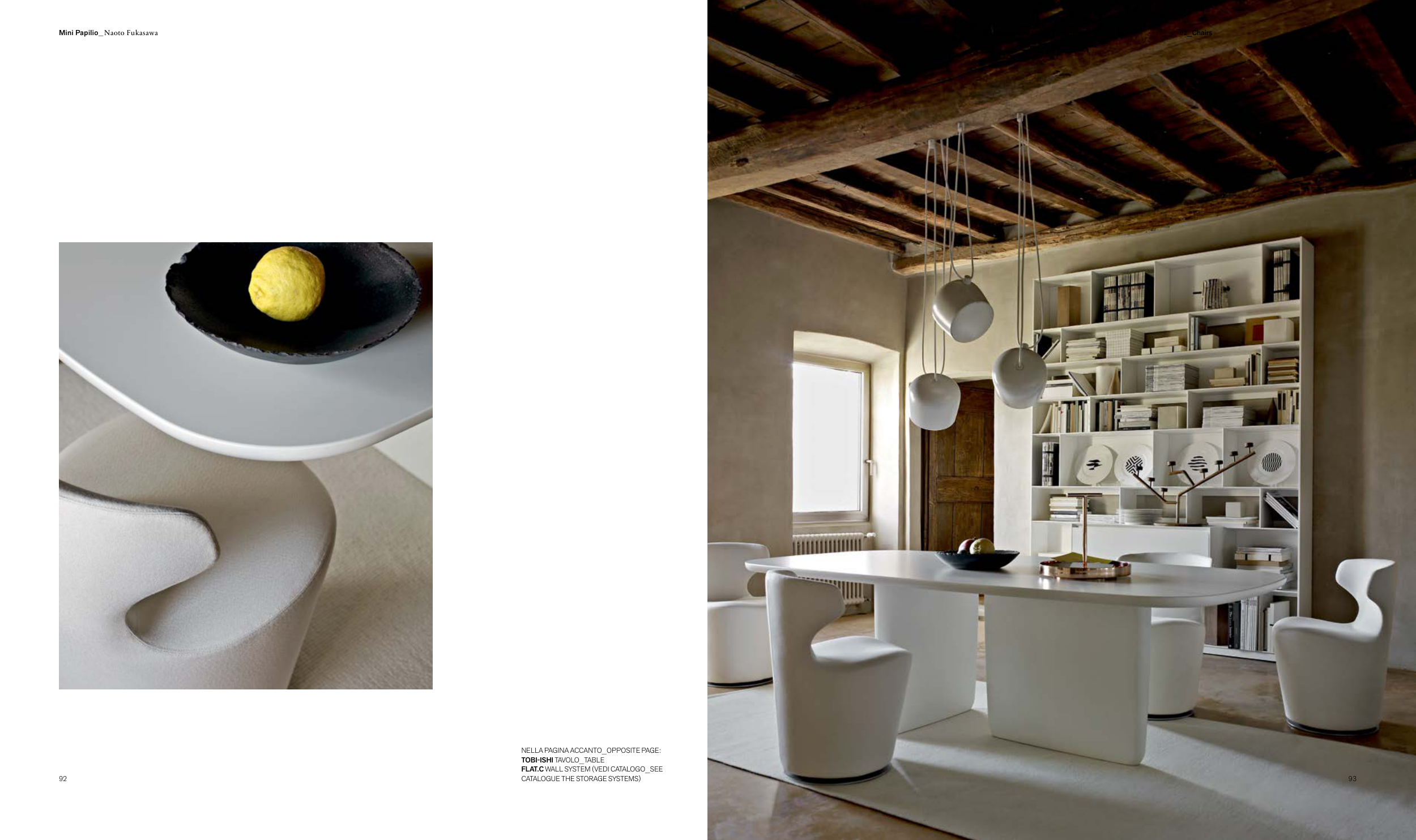 NELLA PAGINA ACCANTO_OPPOSITE PAGE: TOBI-ISHI TAVOLO_TABLE FLAT.C WALL SYSTEM (VEDI CATALOGO_SEE CATALOGUE THE STORAGE SYSTEMS) 92 The Collection 2018 / Volume 2 02_Chairs 93 Mini Papilio_Naoto Fukasawa
