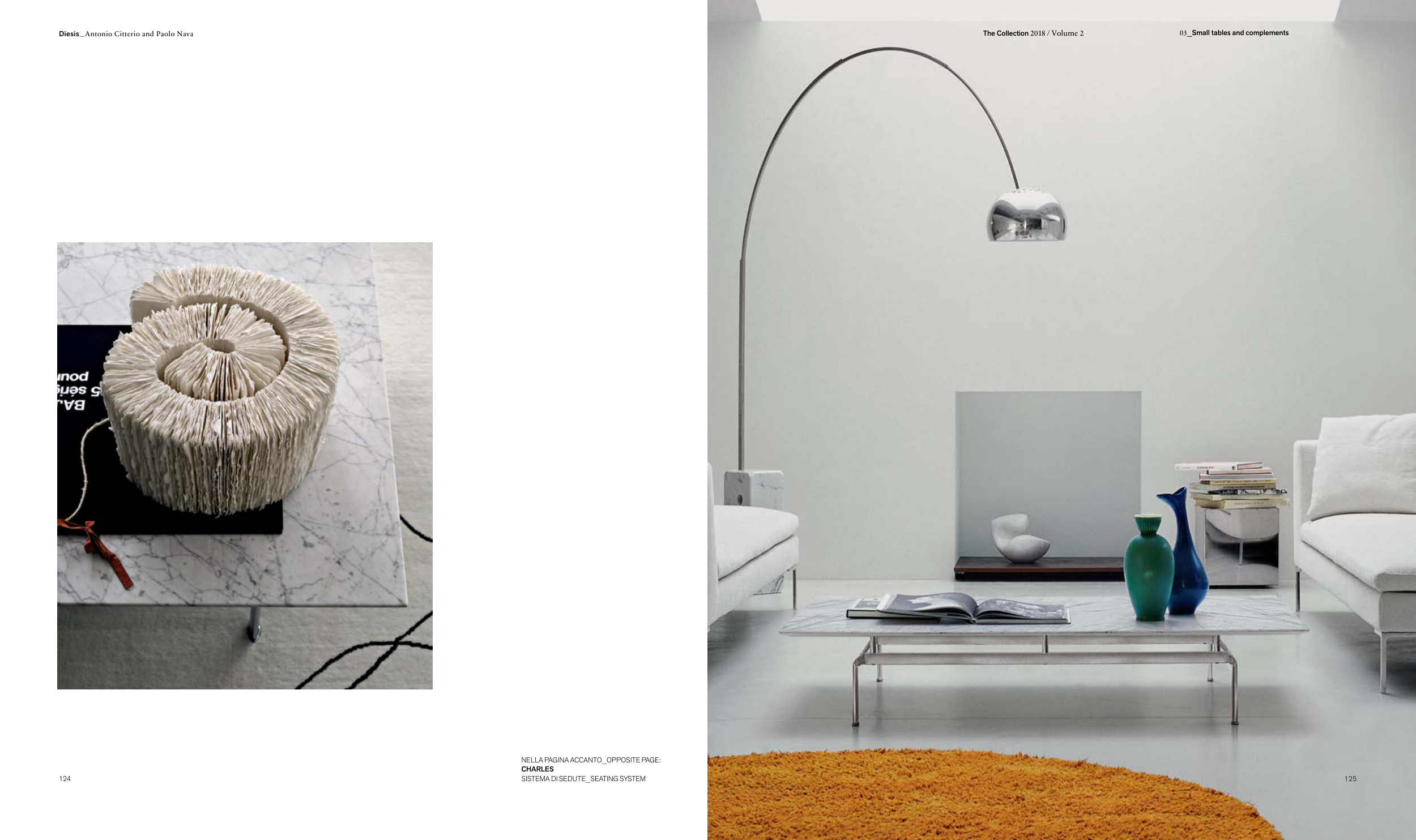 NELLA PAGINA ACCANTO_OPPOSITE PAGE: CHARLES SISTEMA DI SEDUTE_SEATING SYSTEM 124 The Collection 2018 / Volume 2 03_Small tables and complements 125 Diesis_ Antonio Citterio and Paolo Nava