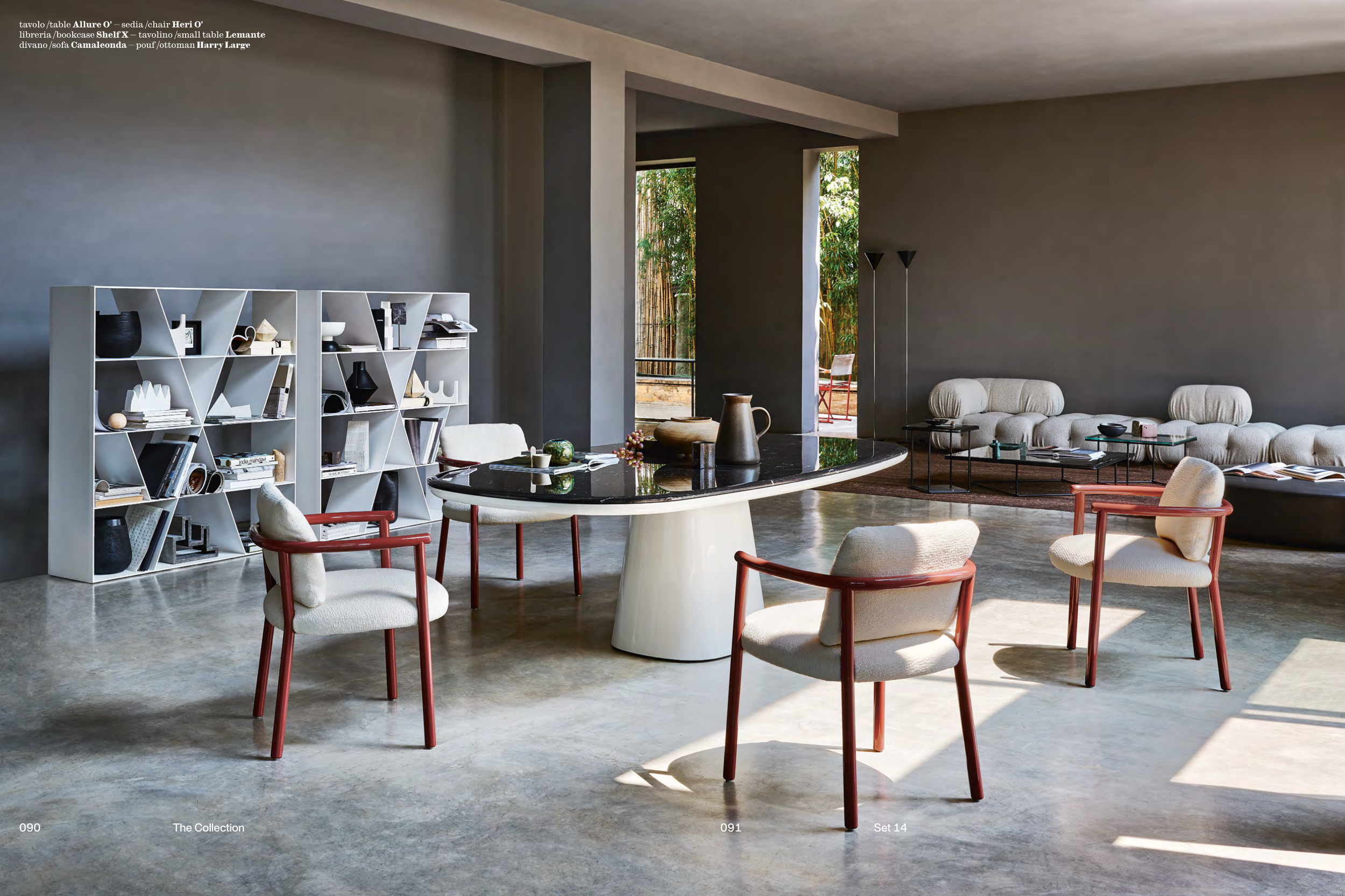 tavolo /table Allure O' — sedia /chair Heri O' libreria /bookcase Shelf X — tavolino /small table Lemante divano /sofa Camaleonda — pouf /ottoman Harry Large 091 Set 14 090 The Collection