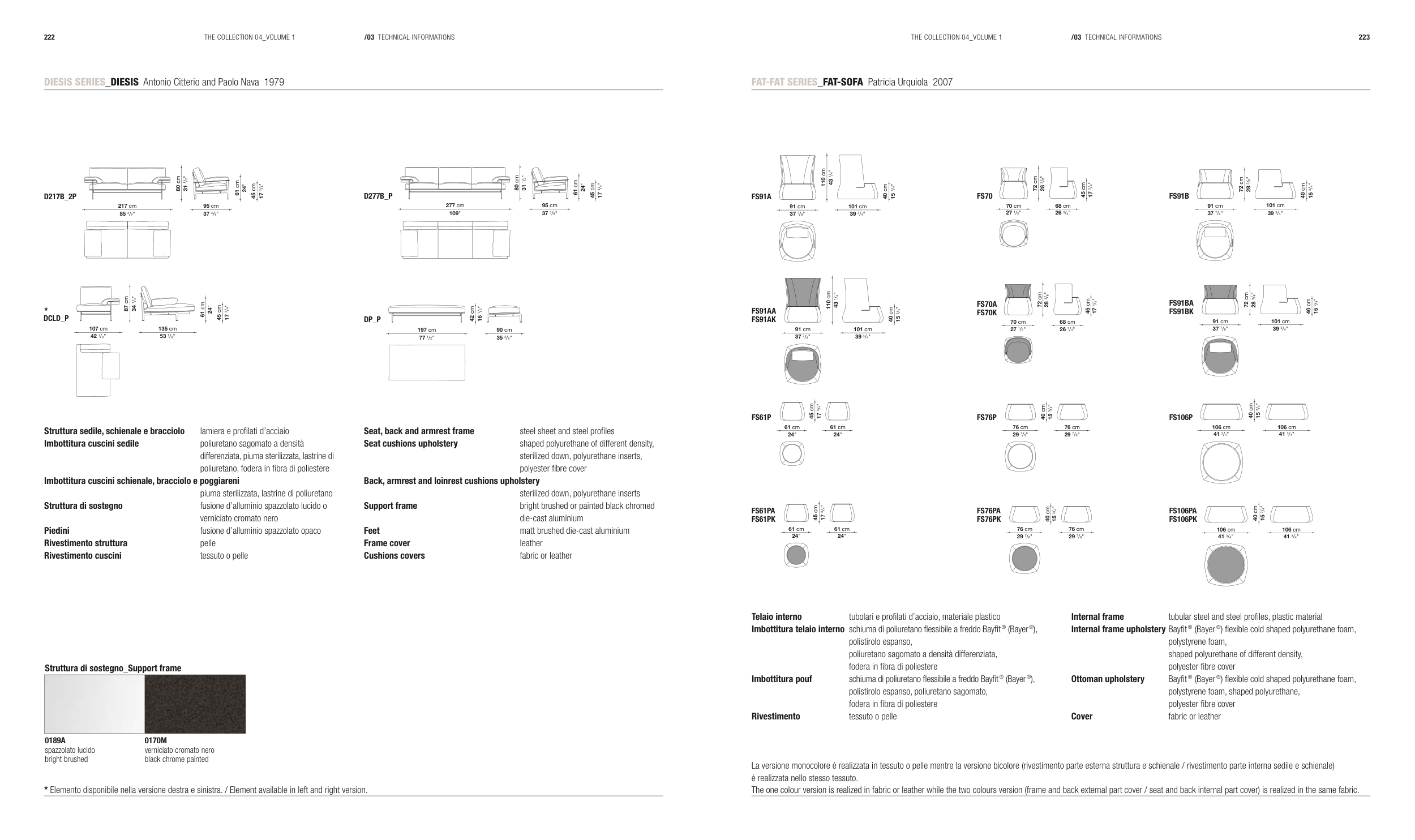 The one colour version is realized in fabric or leather while the two colours version (frame and back external part cover / seat and back internal part cover) is realized in the same fabric.