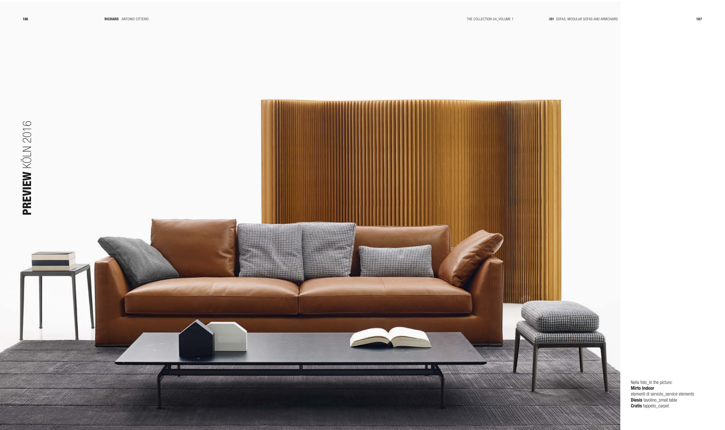 THE COLLECTION 04_VOLUME 1 /01 SOFAS, MODULAR SOFAS AND ARMCHAIRS 187 Nella foto_In the picture: Mirto Indoor elementi di servizio_service elements Diesis tavolino_small table Cratis tappeto_carpet RICHARD ANTONIO CITTERIO
