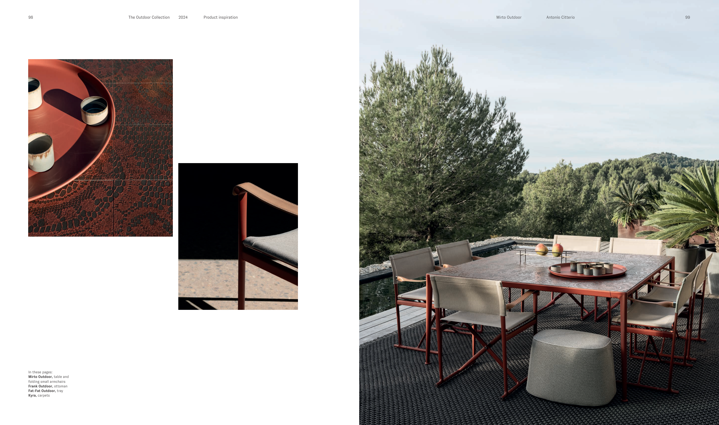 Antonio Citterio Mirto Outdoor 99 98 The Outdoor Collection 2024 Product inspiration In these pages: Mirto Outdoor, table and folding small armchairs Frank Outdoor, ottoman Fat-Fat Outdoor, tray Kyra, carpets