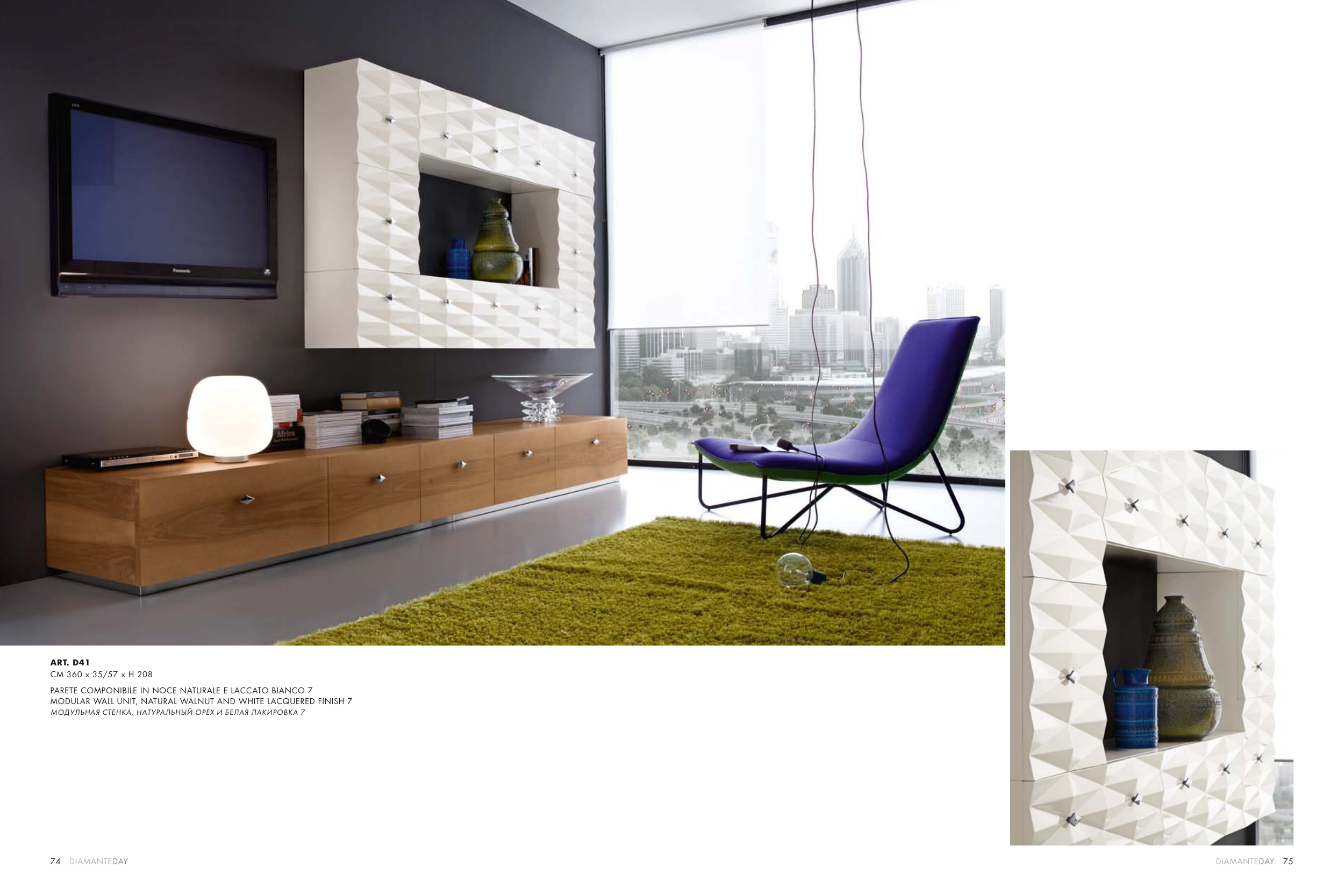 75 74 ART. D41 CM 360 x 35/57 x H 208 PARETE COMPONIBILE IN NOCE NATURALE E LACCATO BIANCO 7 MODULAR WALL UNIT, NATURAL WALNUT AND WHITE LACQUERED FINISH 7 МОДУЛЬНАЯ СТЕНКА, НАТУРАЛЬНЫЙ ОРЕХ И БЕЛАЯ ЛАКИРОВКА 7