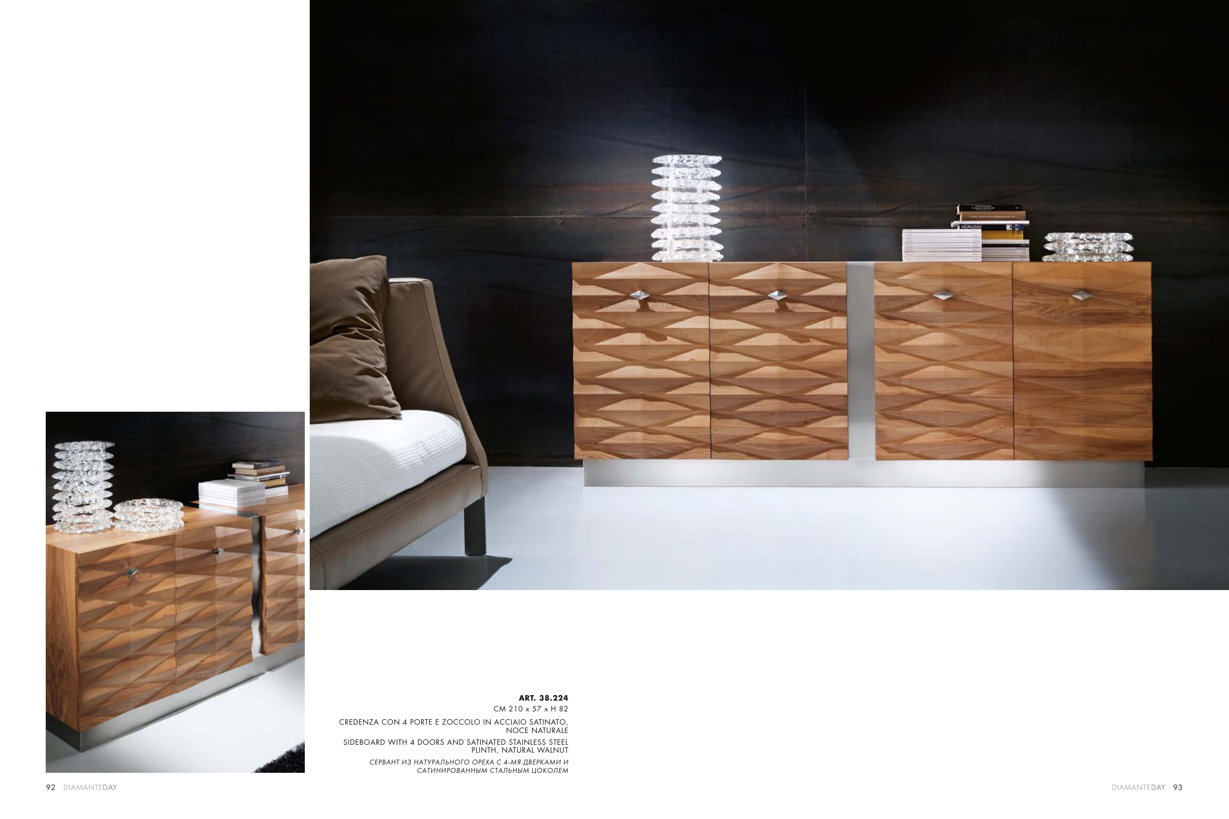 93 92 ART. 38.224 CM 210 x 57 x H 82 CREDENZA CON 4 PORTE E ZOCCOLO IN ACCIAIO SATINATO, NOCE NATURALE SIDEBOARD WITH 4 DOORS AND SATINATED STAINLESS STEEL PLINTH, NATURAL WALNUT СЕРВАНТ ИЗ НАТУРАЛЬНОГО ОРЕХА С 4-МЯ ДВЕРКАМИ И САТИНИРОВАННЫМ СТАЛЬНЫМ ЦОКОЛЕМ
