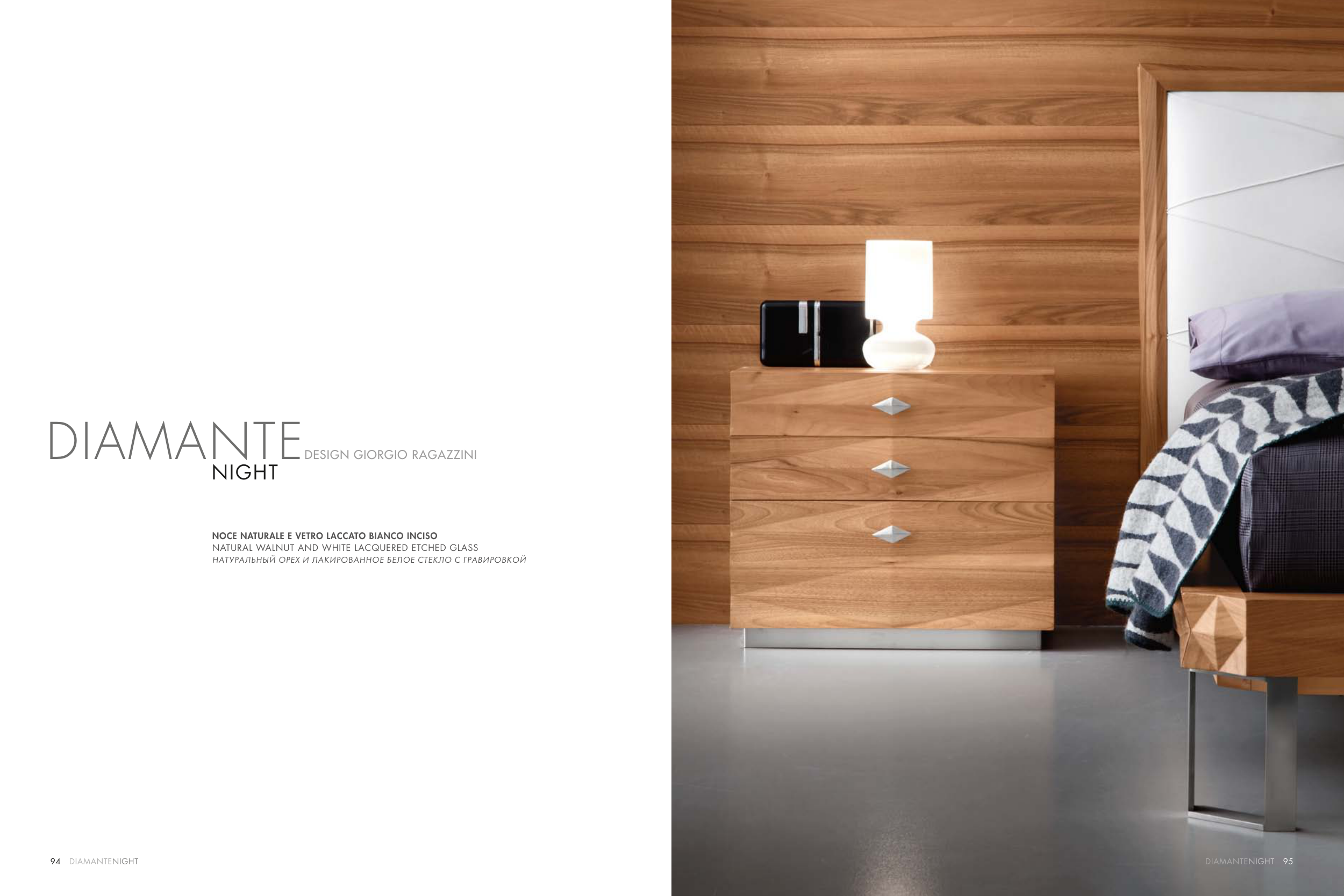 94 DIAMANTEDESIGN GIORGIO RAGAZZINI NIGHT NOCE NATURALE E VETRO LACCATO BIANCO INCISO NATURAL WALNUT AND WHITE LACQUERED ETCHED GLASS НАТУРАЛЬНЫЙ ОРЕХ И ЛАКИРОВАННОЕ БЕЛОЕ СТЕКЛО С ГРАВИРОВКОЙ 95