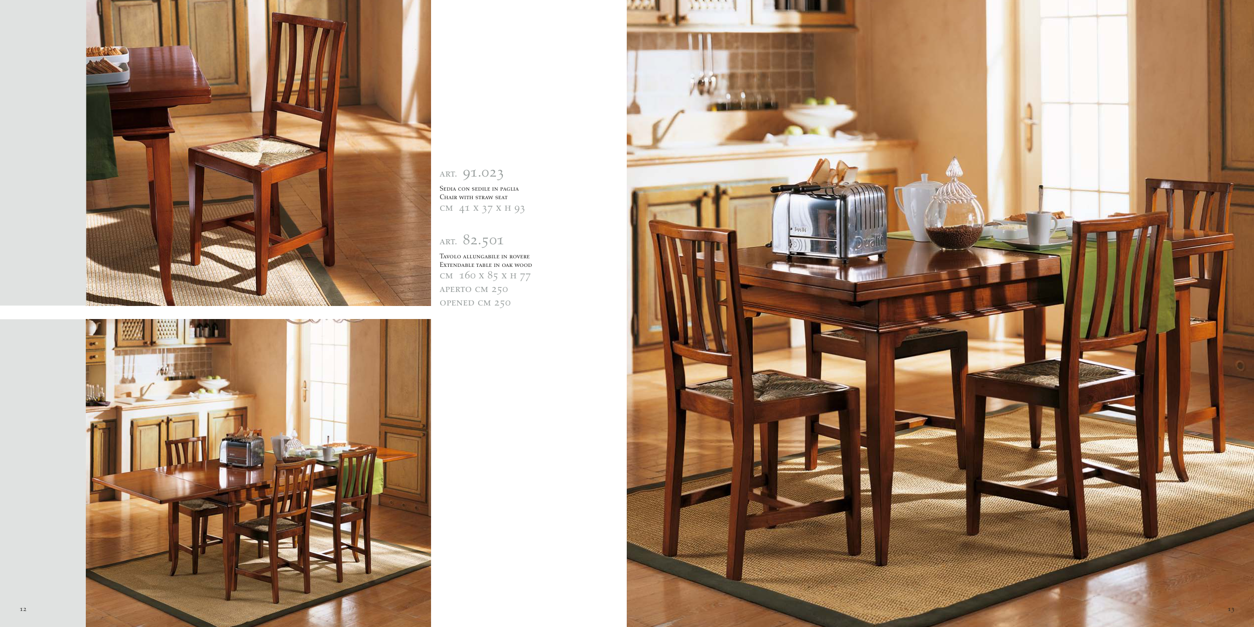 12 art. 91.023 Sedia con sedile in paglia Chair with straw seat cm 41 x 37 x h 93 art. 82.501 Tavolo allungabile in rovere Extendable table in oak wood cm 160 x 85 x h 77 aperto cm 250 opened cm 250 13