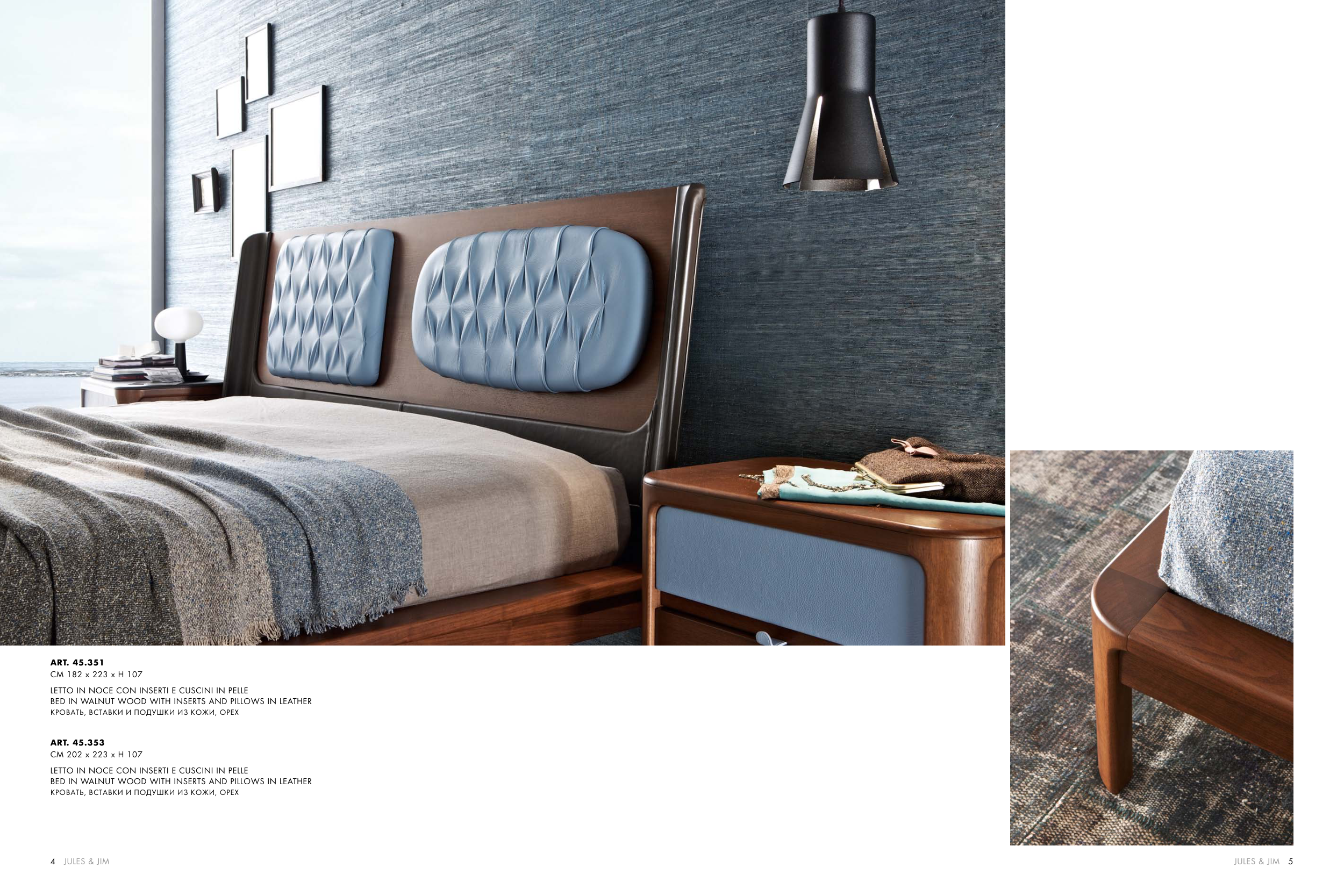 BED IN WALNUT WOOD WITH INSERTS AND PILLOWS IN LEATHER