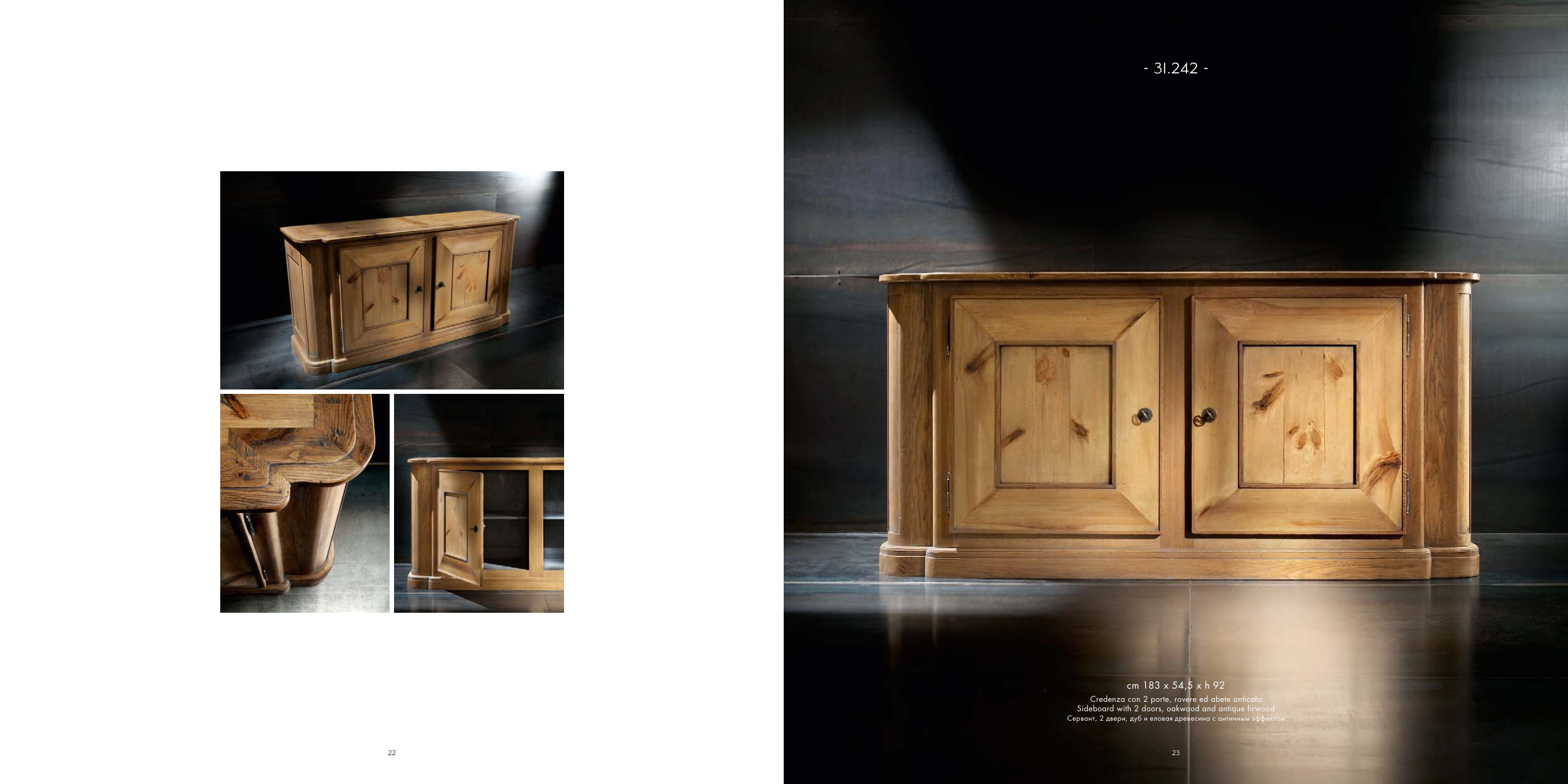 22 23 - 31.242 - cm 183 x 54,5 x h 92 Credenza con 2 porte, rovere ed abete anticato Sideboard with 2 doors, oakwood and antique firwood Сервант, 2 двери, дуб и еловая древесина с античным эффектом