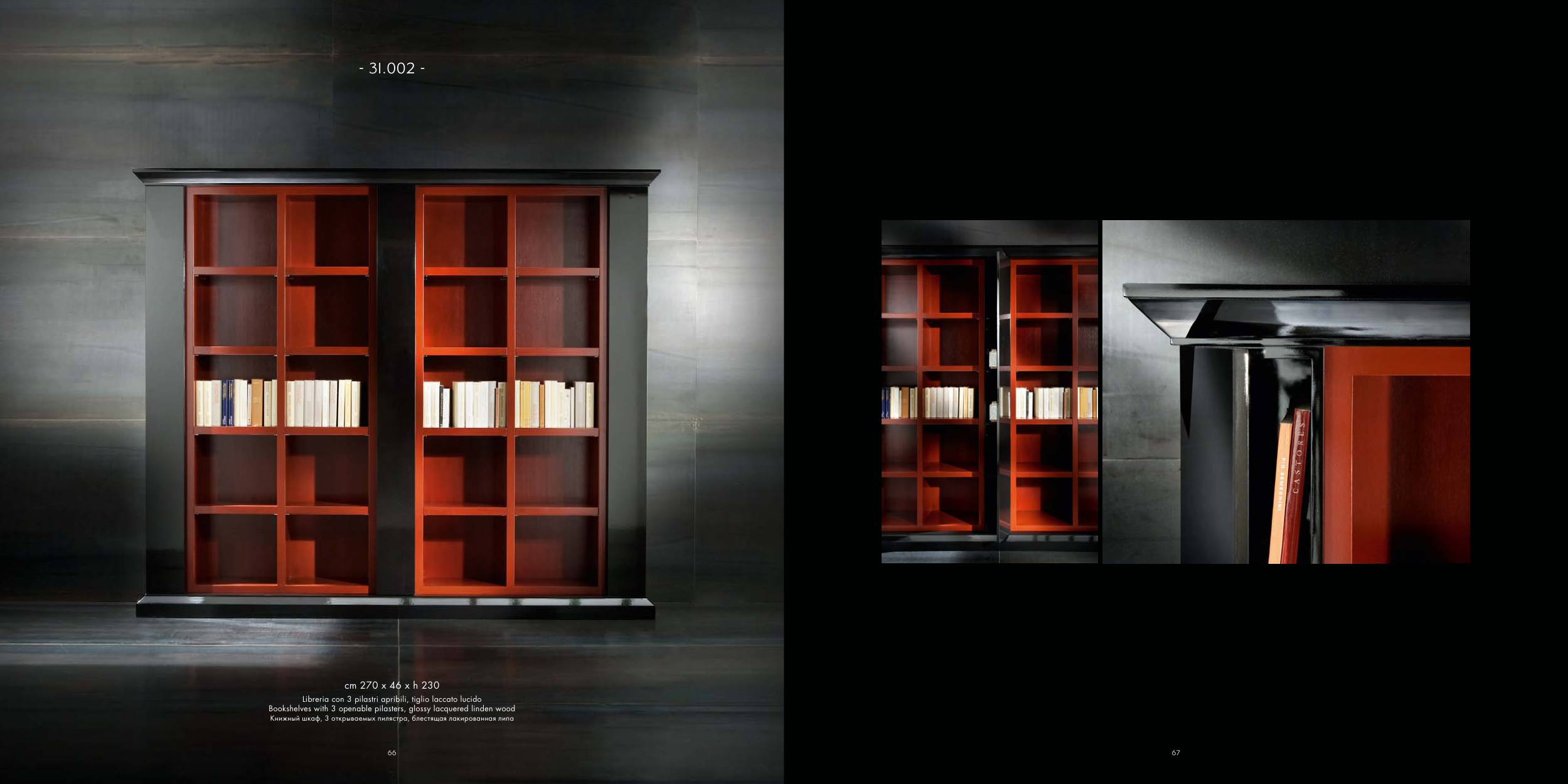 Bookshelves with 3 openable pilasters, glossy lacquered linden wood