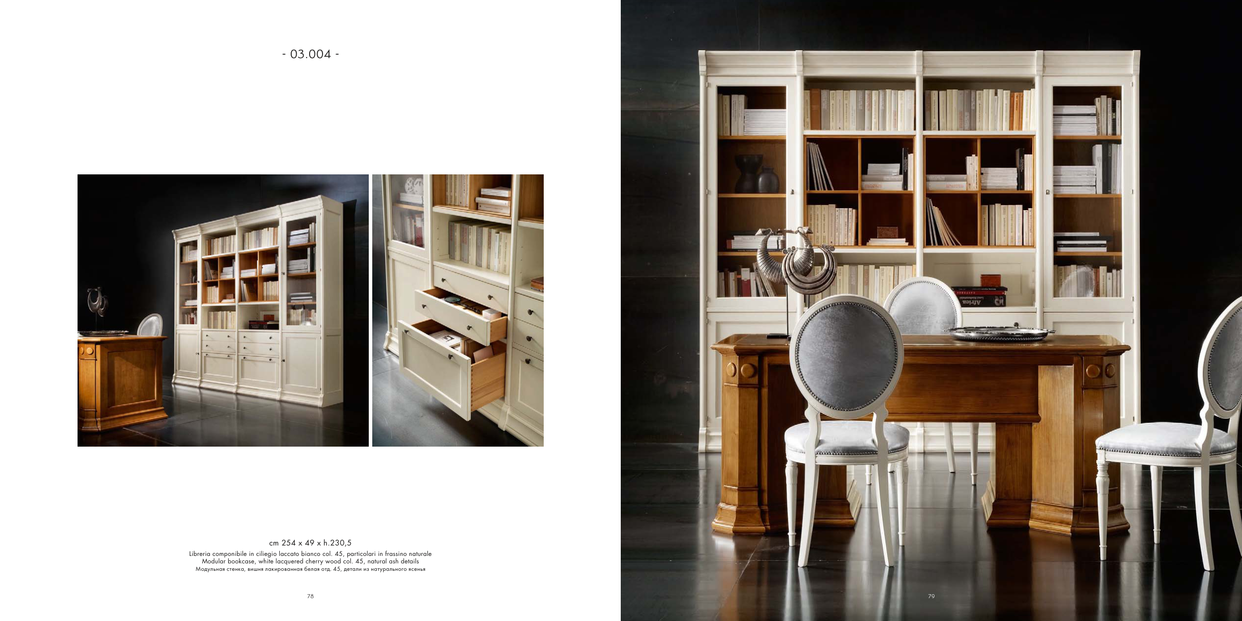 Libreria componibile in ciliegio laccato bianco col. 45, particolari in frassino naturale