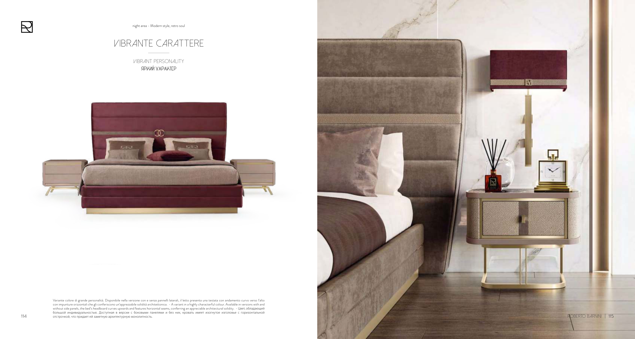 without side panels, the bed’s headboard curves upwards and features horizontal seams, conferring an appreciable architectural solidity. - Цвет, обладающий