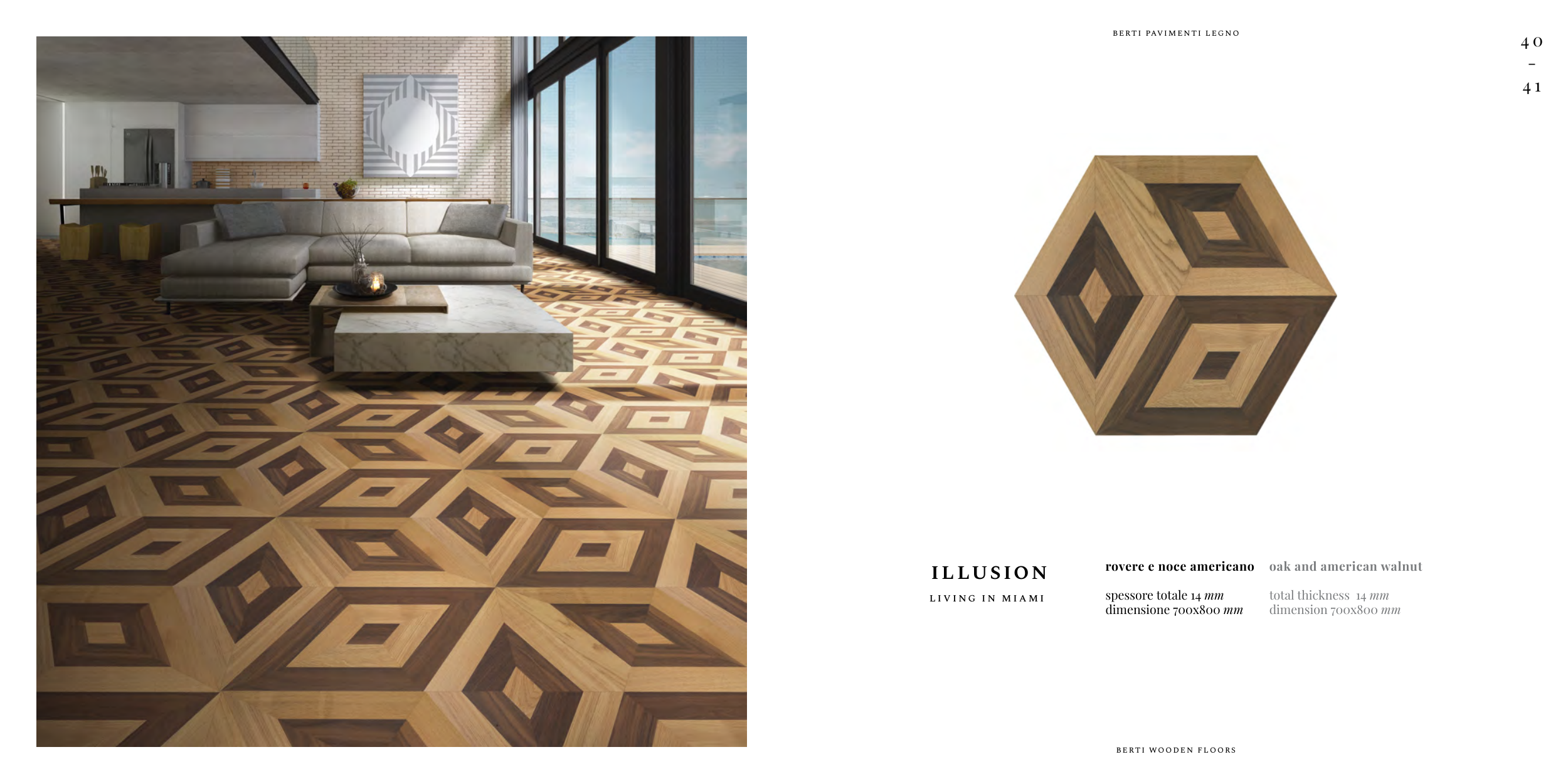 4 0 - 4 1 berti pavimenti legno berti wooden floors li v i ng i n mi a mi rovere e noce americano spessore totale 14 mm dimensione 700x800 mm oak and american walnut total thickness 14 mm dimension 700x800 mm illusion