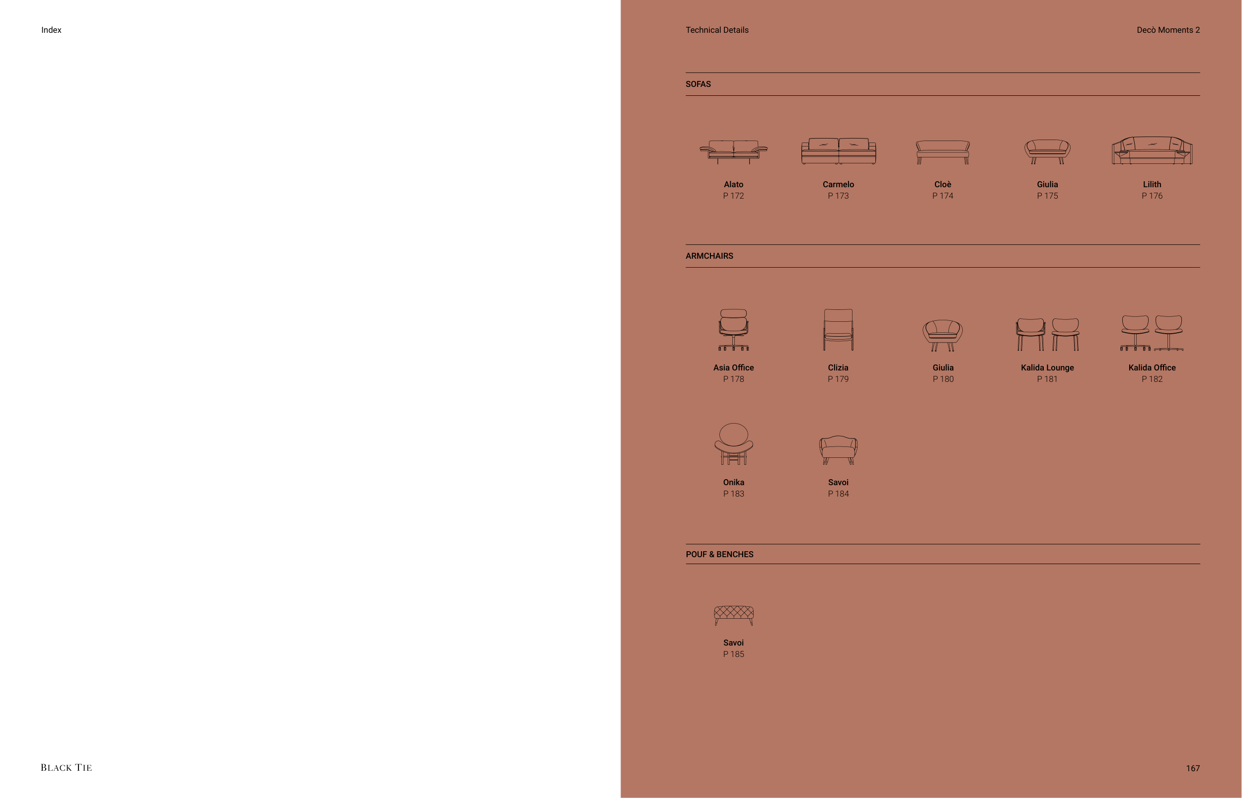 Asia Office P 178 Clizia P 179 Giulia P 180 Kalida Office P 182 Kalida Lounge P 181 P 183 Onika Lilith Alato P 176 P 172 Giulia SOFAS ARMCHAIRS Cloè P 175 P 174 P 185 POUF & BENCHES Savoi P 184 Savoi Carmelo P 173 Technical Details Decò Moments 2 167 Index