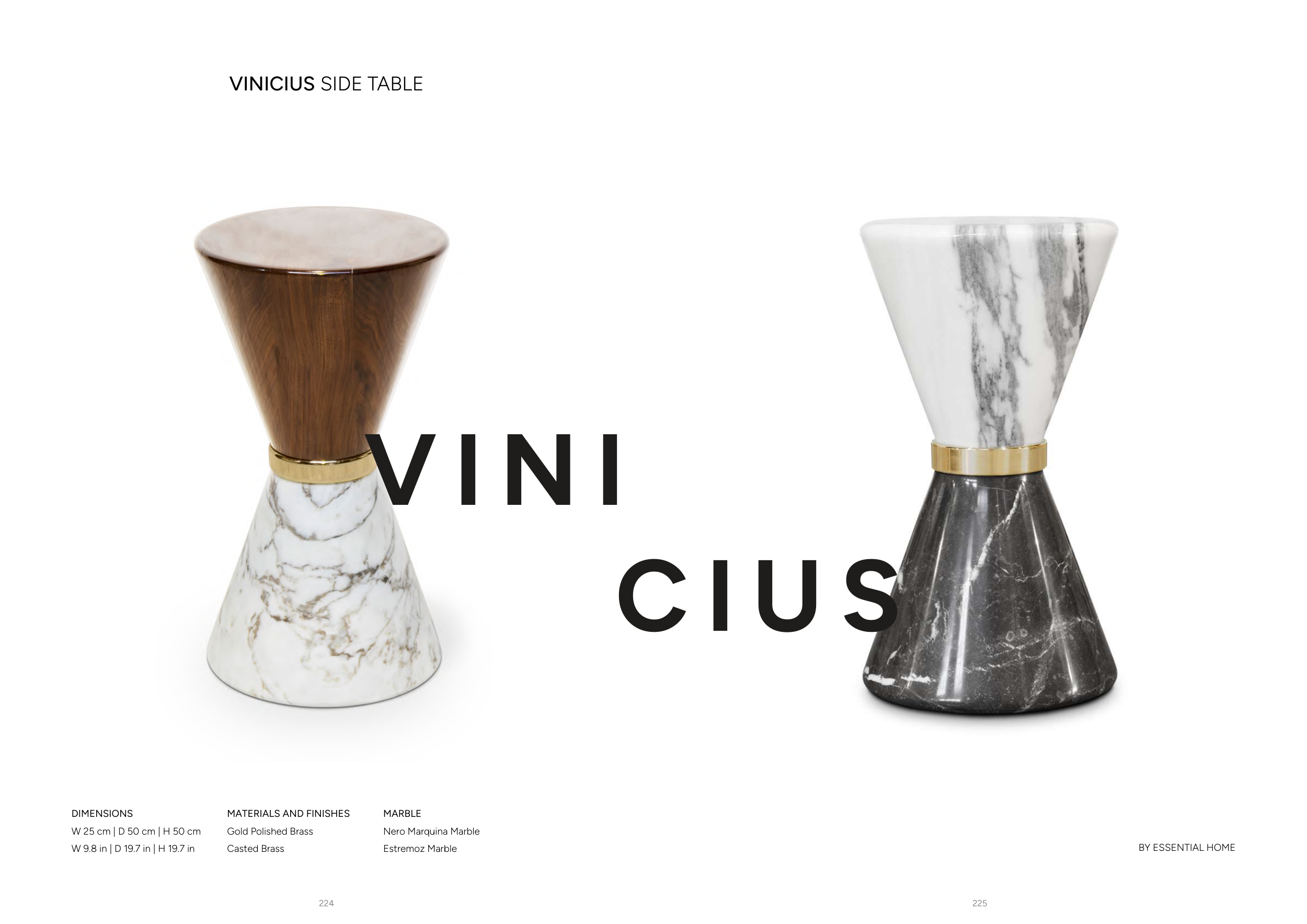 225 224 VINICIUS SIDE TABLE MARBLE Nero Marquina Marble Estremoz Marble MATERIALS AND FINISHES Gold Polished Brass Casted Brass DIMENSIONS W 25 cm | D 50 cm | H 50 cm W 9.8 in | D 19.7 in | H 19.7 in V I N I BY ESSENTIAL HOME C I U S