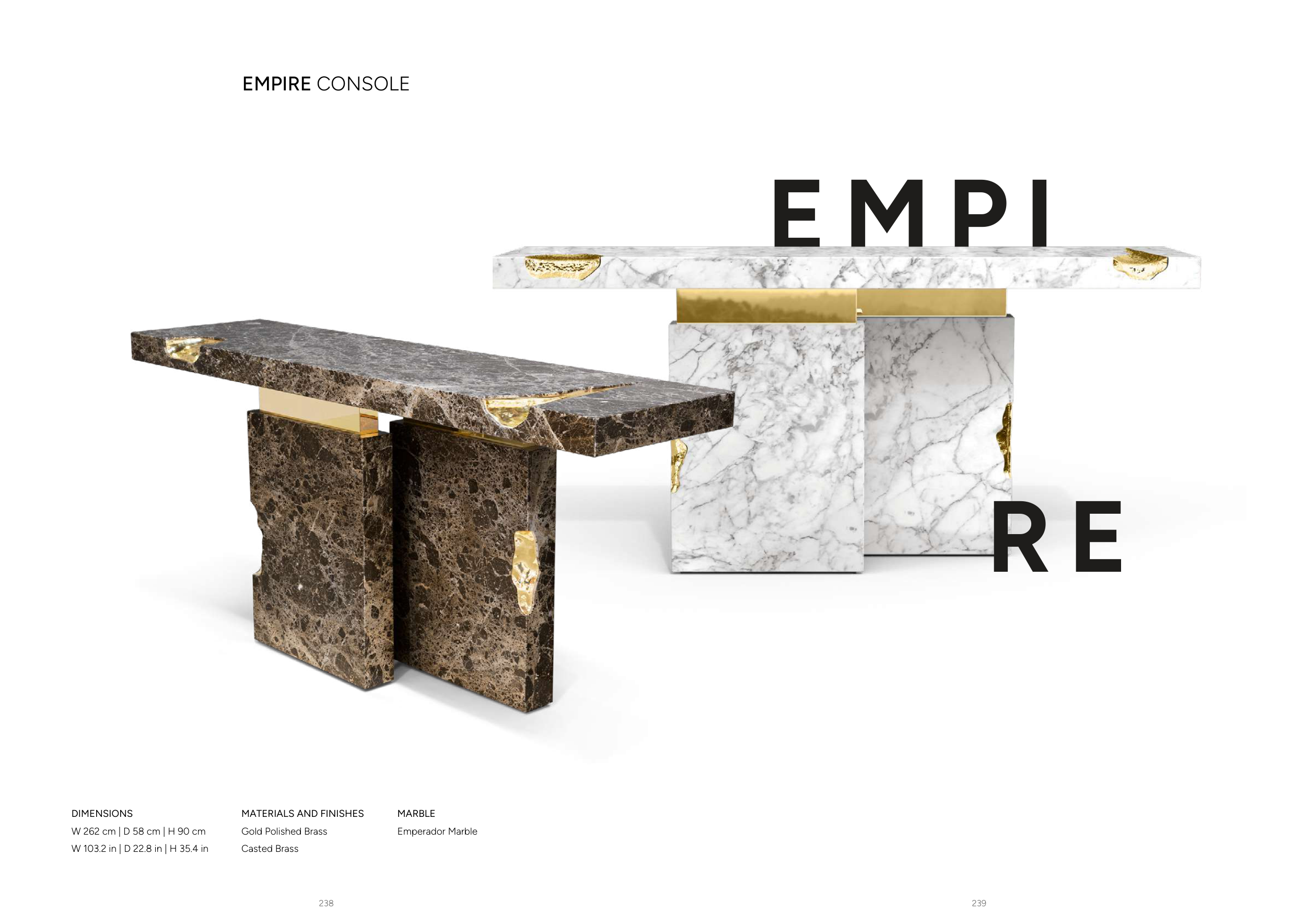239 238 EMPIRE CONSOLE DIMENSIONS W 262 cm | D 58 cm | H 90 cm W 103.2 in | D 22.8 in | H 35.4 in MARBLE Emperador Marble MATERIALS AND FINISHES Gold Polished Brass Casted Brass E M P I R E