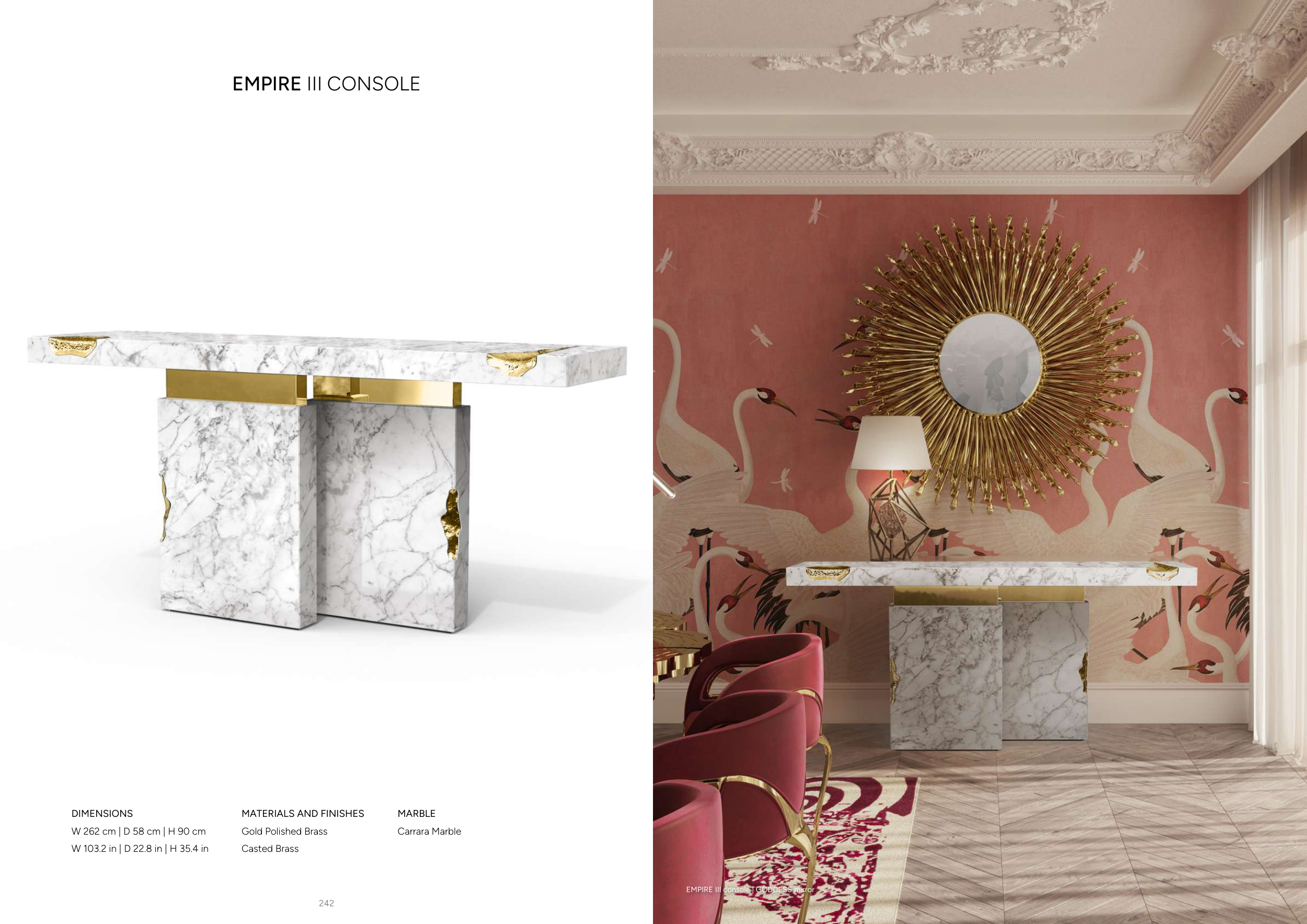 243 242 EMPIRE III CONSOLE DIMENSIONS W 262 cm | D 58 cm | H 90 cm W 103.2 in | D 22.8 in | H 35.4 in MARBLE Carrara Marble MATERIALS AND FINISHES Gold Polished Brass Casted Brass EMPIRE III console | GODDESS mirror