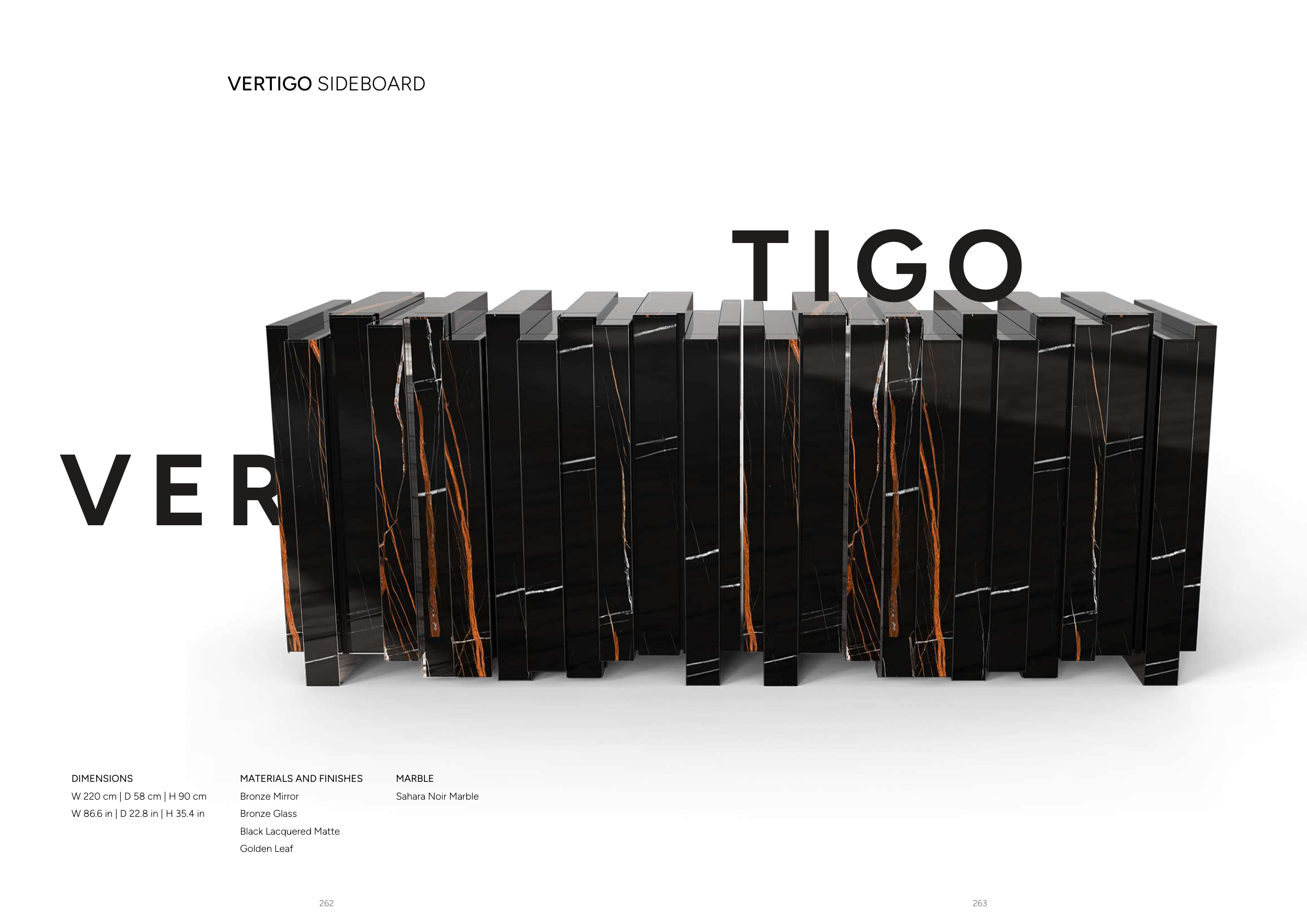 263 262 V E R DIMENSIONS W 220 cm | D 58 cm | H 90 cm W 86.6 in | D 22.8 in | H 35.4 in VERTIGO SIDEBOARD MARBLE Sahara Noir Marble MATERIALS AND FINISHES Bronze Mirror Bronze Glass Black Lacquered Matte Golden Leaf T I G O