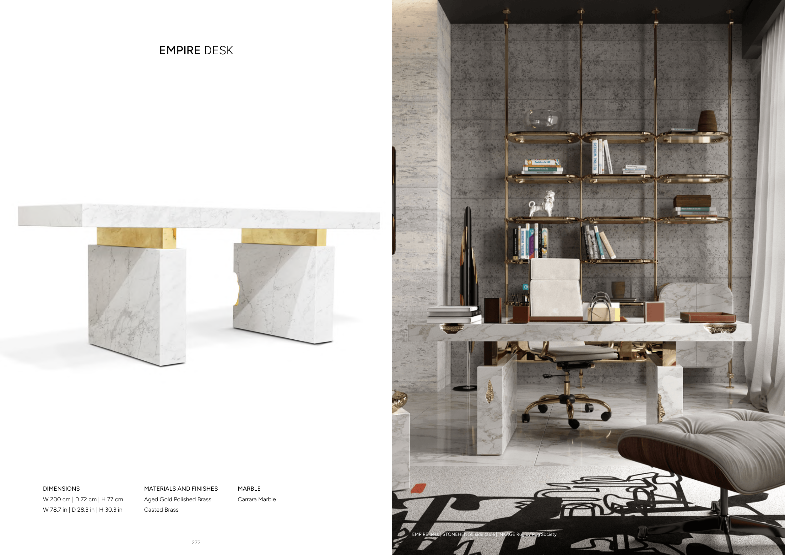273 272 EMPIRE DESK DIMENSIONS W 200 cm | D 72 cm | H 77 cm W 78.7 in | D 28.3 in | H 30.3 in MARBLE Carrara Marble MATERIALS AND FINISHES Aged Gold Polished Brass Casted Brass EMPIRE desk | STONEHENGE side table | INKAGE Rug by Rug’Society
