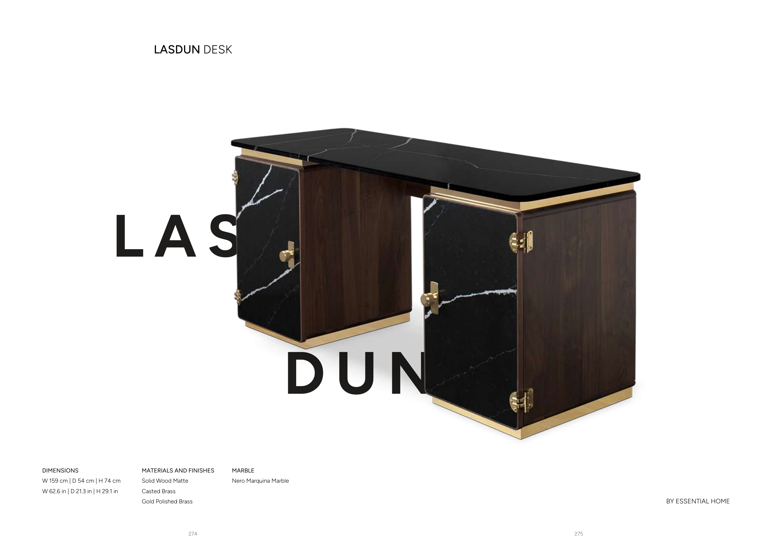 275 274 L A S D U N LASDUN DESK DIMENSIONS W 159 cm | D 54 cm | H 74 cm W 62.6 in | D 21.3 in | H 29.1 in MARBLE Nero Marquina Marble MATERIALS AND FINISHES Solid Wood Matte Casted Brass Gold Polished Brass BY ESSENTIAL HOME