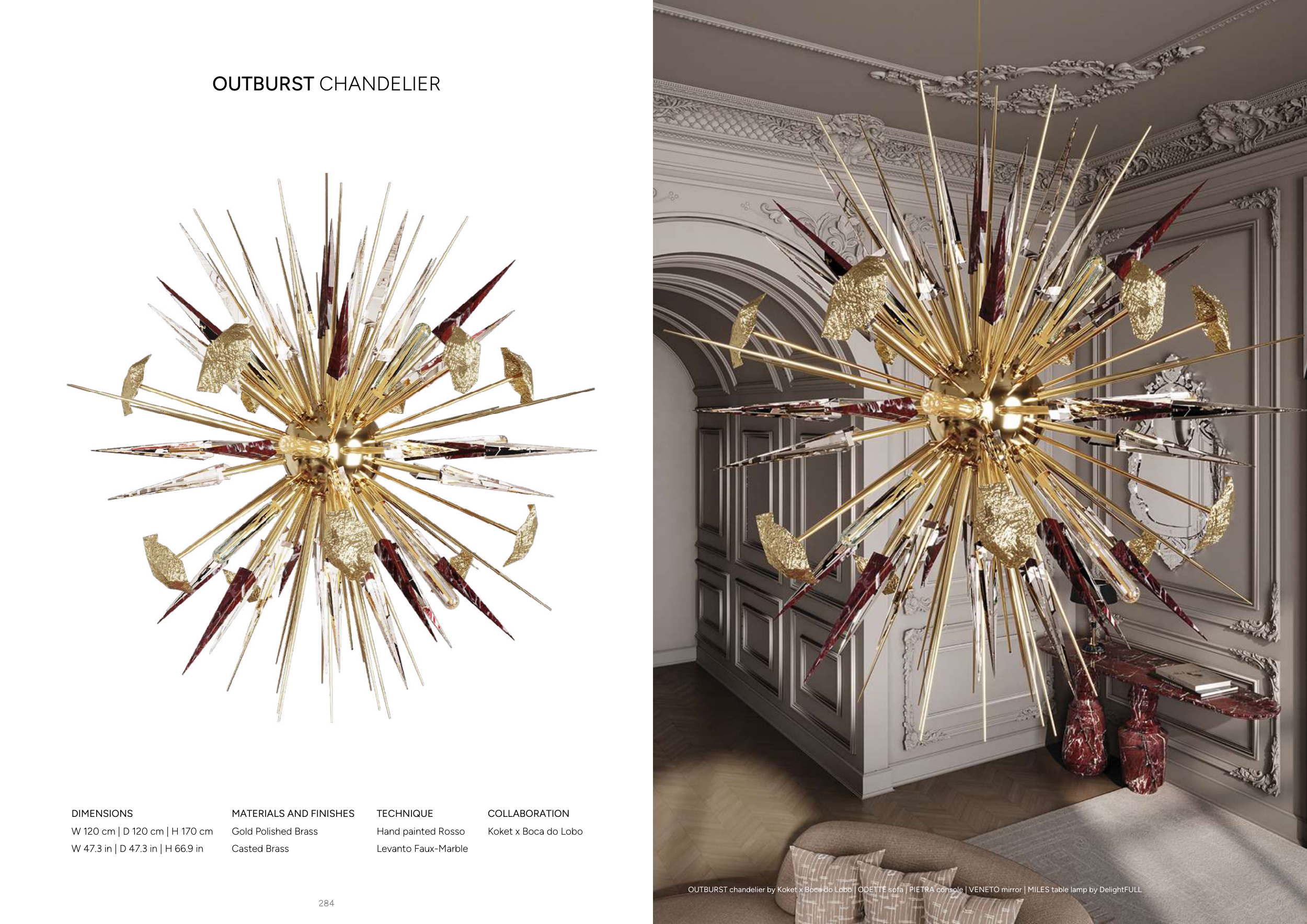 OUTBURST chandelier by Koket x Boca do Lobo | ODETTE sofa | PIETRA console | VENETO mirror | MILES table lamp by DelightFULL