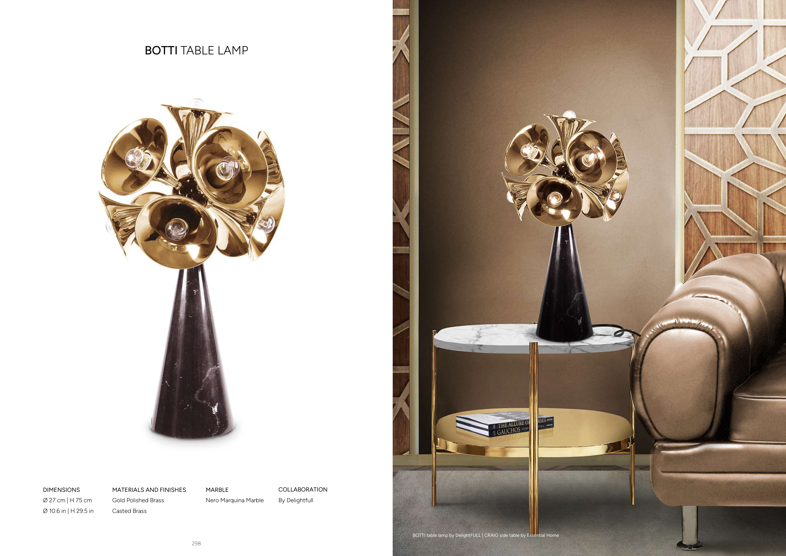 299 298 BOTTI TABLE LAMP DIMENSIONS Ø 27 cm | H 75 cm Ø 10.6 in | H 29.5 in MARBLE Nero Marquina Marble COLLABORATION By Delightfull MATERIALS AND FINISHES Gold Polished Brass Casted Brass BOTTI table lamp by DelightFULL | CRAIG side table by Essential Home