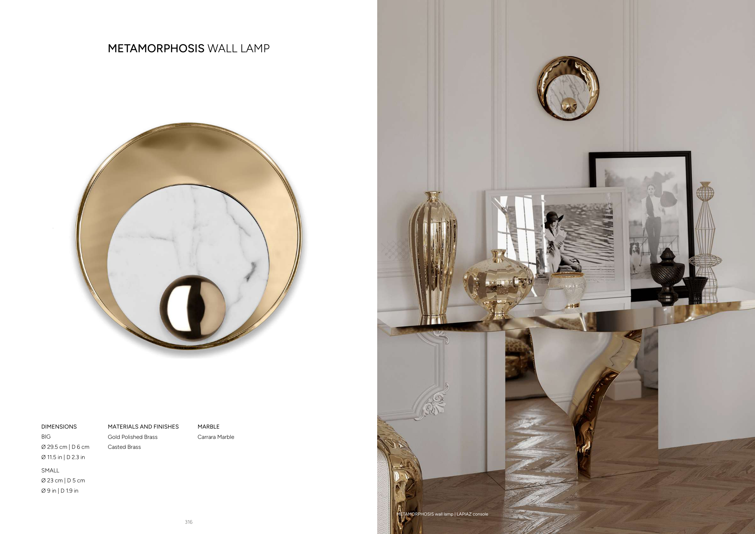 317 316 METAMORPHOSIS WALL LAMP SMALL Ø 23 cm | D 5 cm Ø 9 in | D 1.9 in DIMENSIONS BIG Ø 29.5 cm | D 6 cm Ø 11.5 in | D 2.3 in MARBLE Carrara Marble MATERIALS AND FINISHES Gold Polished Brass Casted Brass METAMORPHOSIS wall lamp | LAPIAZ console