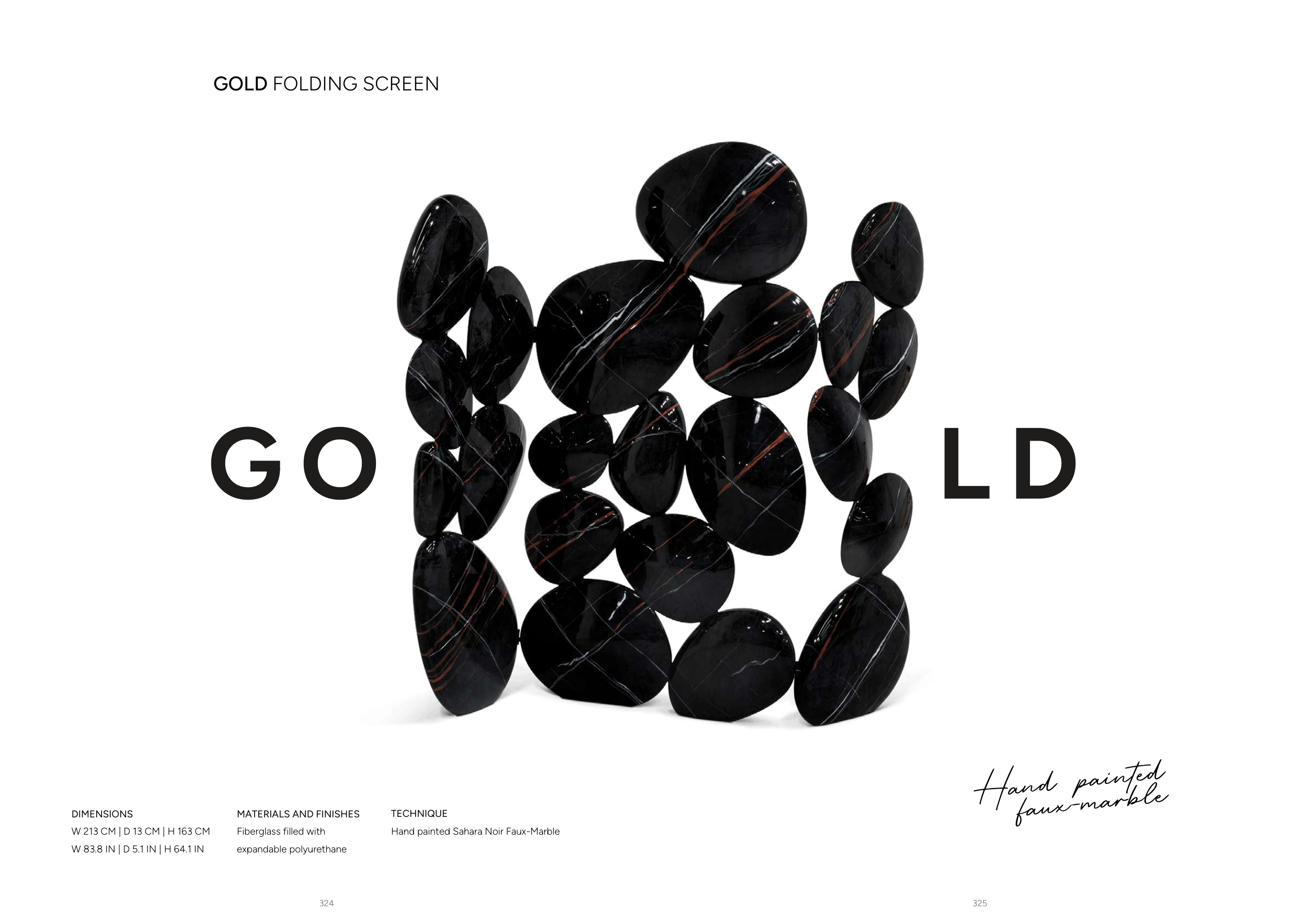 325 324 GOLD FOLDING SCREEN DIMENSIONS W 213 CM | D 13 CM | H 163 CM W 83.8 IN | D 5.1 IN | H 64.1 IN MATERIALS AND FINISHES Fiberglass filled with expandable polyurethane TECHNIQUE Hand painted Sahara Noir Faux-Marble G O L D Hand painted faux-marble