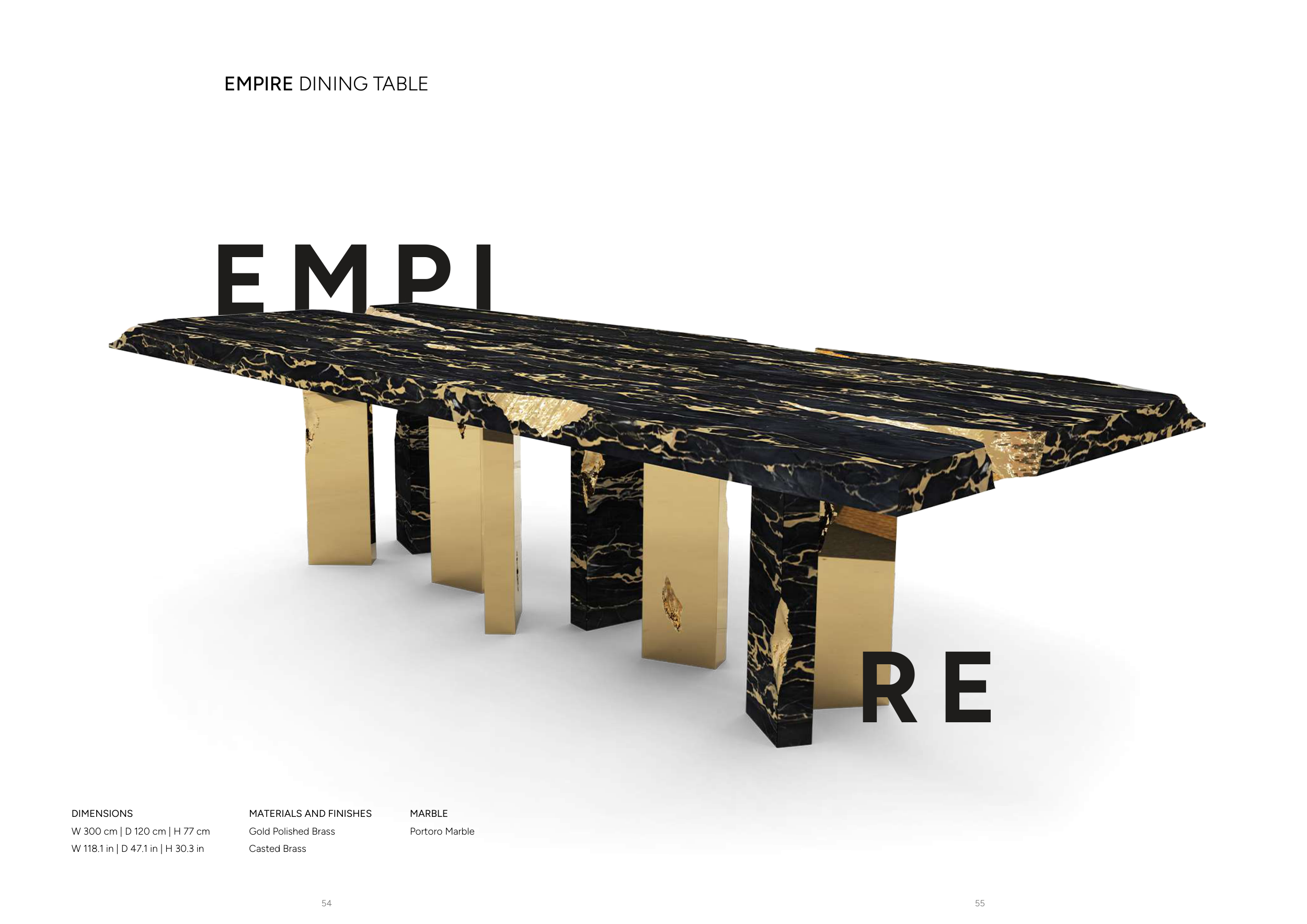55 54 EMPIRE DINING TABLE E M P I R E DIMENSIONS W 300 cm | D 120 cm | H 77 cm W 118.1 in | D 47.1 in | H 30.3 in MARBLE Portoro Marble MATERIALS AND FINISHES Gold Polished Brass Casted Brass