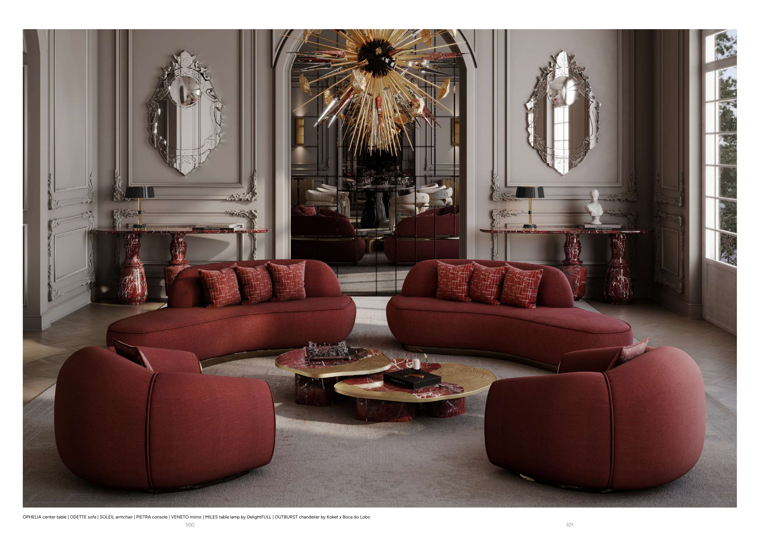 OPHELIA center table | ODETTE sofa | SOLEIL armchair | PIETRA console | VENETO mirror | MILES table lamp by DelightFULL | OUTBURST chandelier by Koket x Boca do Lobo