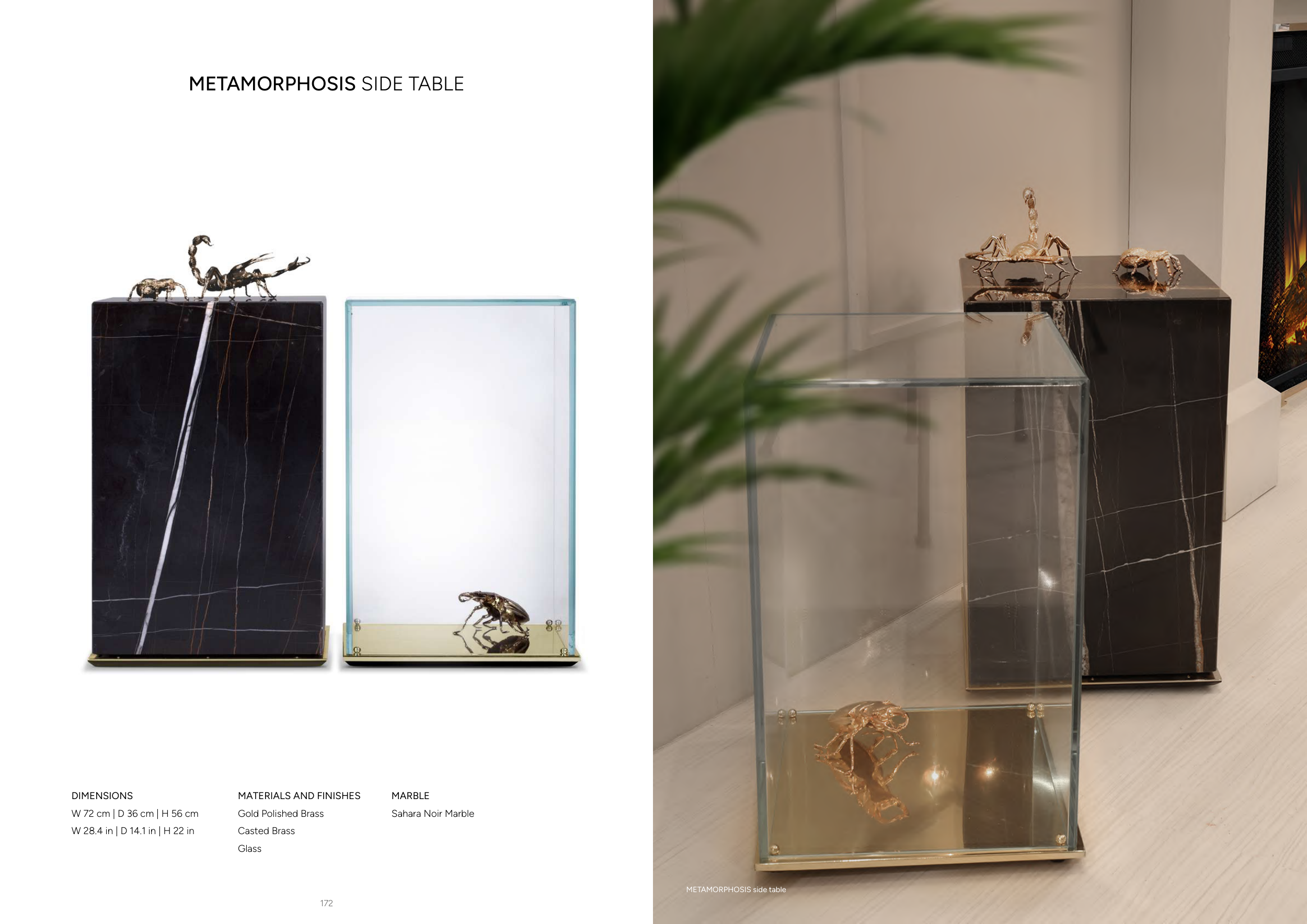 173 172 METAMORPHOSIS SIDE TABLE DIMENSIONS W 72 cm | D 36 cm | H 56 cm W 28.4 in | D 14.1 in | H 22 in MARBLE Sahara Noir Marble MATERIALS AND FINISHES Gold Polished Brass Casted Brass Glass METAMORPHOSIS side table