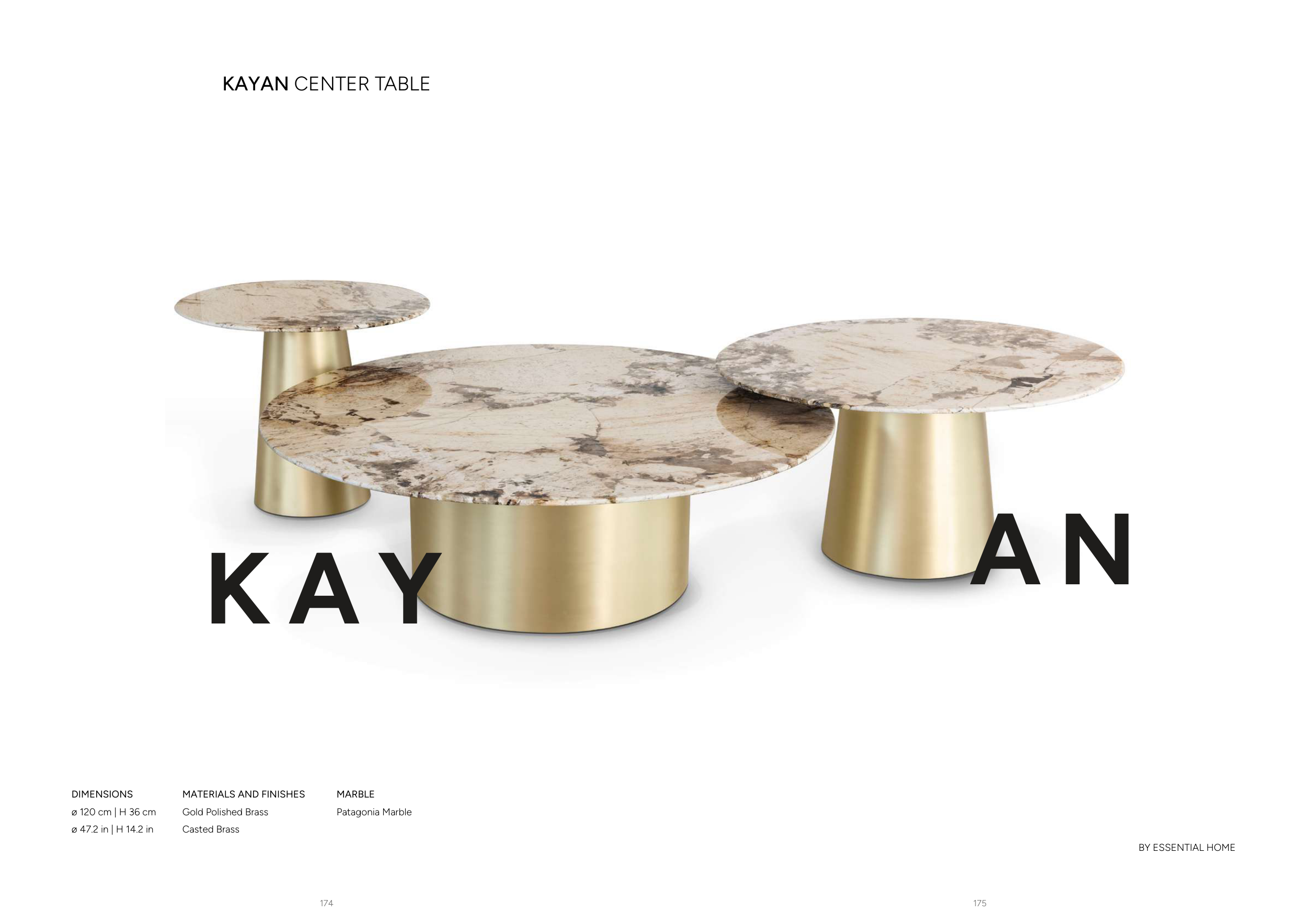 175 174 KAYAN CENTER TABLE MARBLE Patagonia Marble MATERIALS AND FINISHES Gold Polished Brass Casted Brass DIMENSIONS ø 120 cm | H 36 cm ø 47.2 in | H 14.2 in K A Y A N BY ESSENTIAL HOME