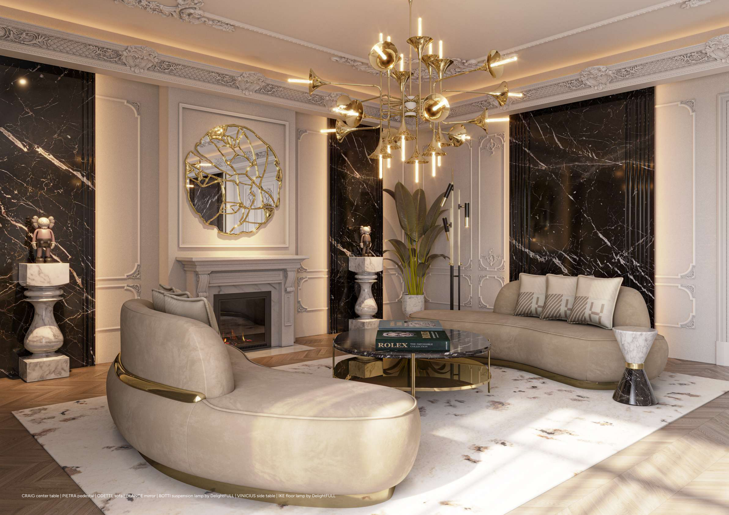CRAIG center table | PIETRA pedestal | ODETTE sofa | GLANCE mirror | BOTTI suspension lamp by DelightFULL | VINICIUS side table | IKE floor lamp by DelightFULL