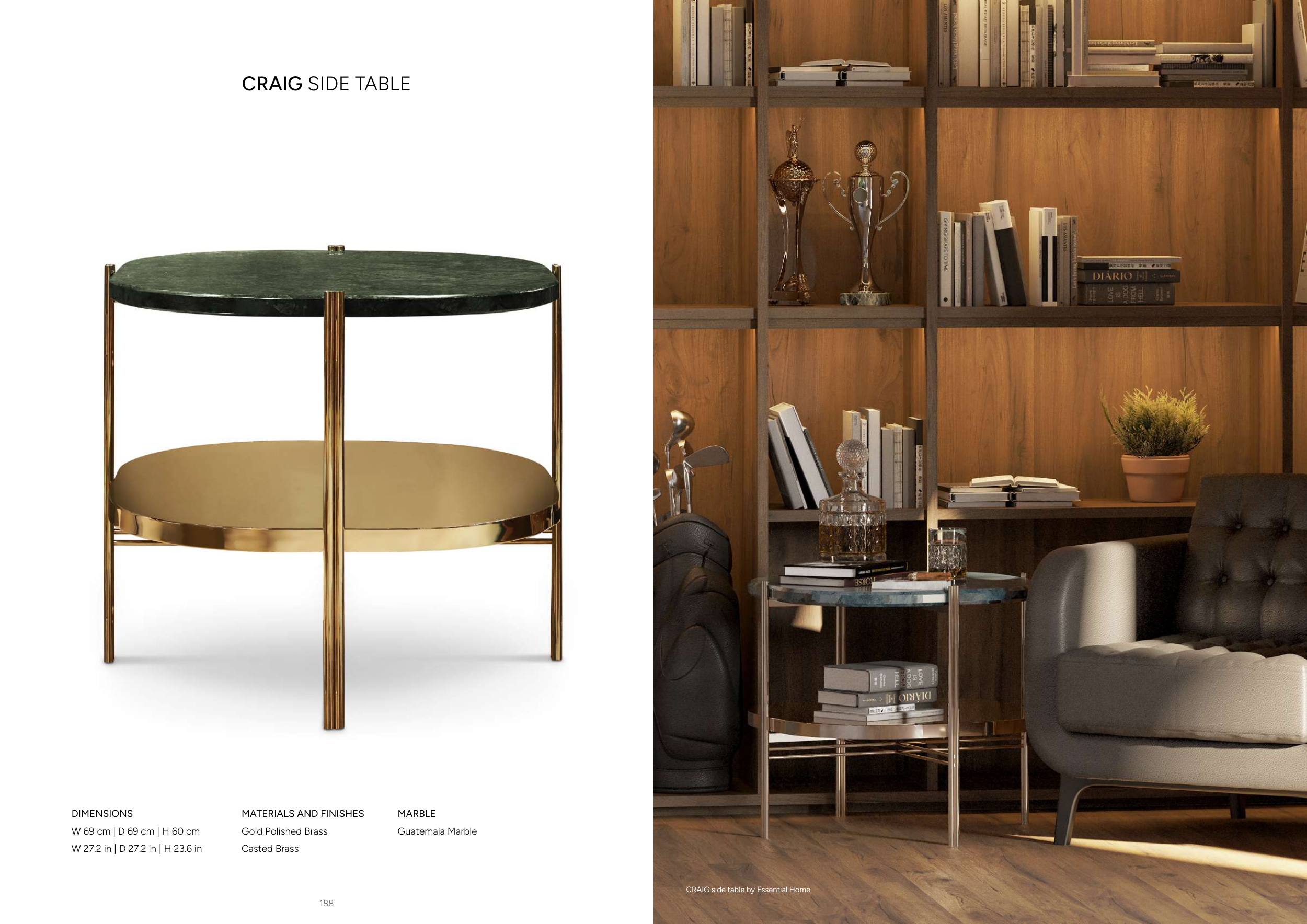 189 188 CRAIG SIDE TABLE DIMENSIONS W 69 cm | D 69 cm | H 60 cm W 27.2 in | D 27.2 in | H 23.6 in MARBLE Guatemala Marble MATERIALS AND FINISHES Gold Polished Brass Casted Brass CRAIG side table by Essential Home