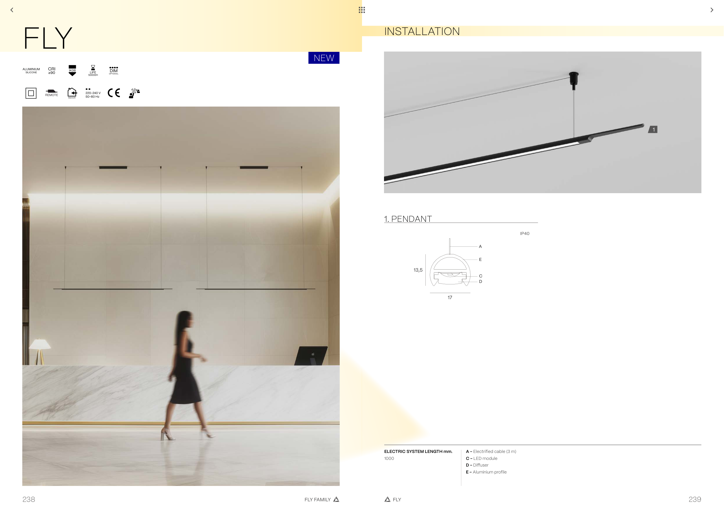 FLY FAMILY FLY 239 238 NEW INSTALLATION FLY 1. PENDANT A E C D 17 13,5 ELECTRIC SYSTEM LENGTH mm. 1000 A - Electrified cable (3 m) C - LED module D - Diffuser E - Aluminium profile 1