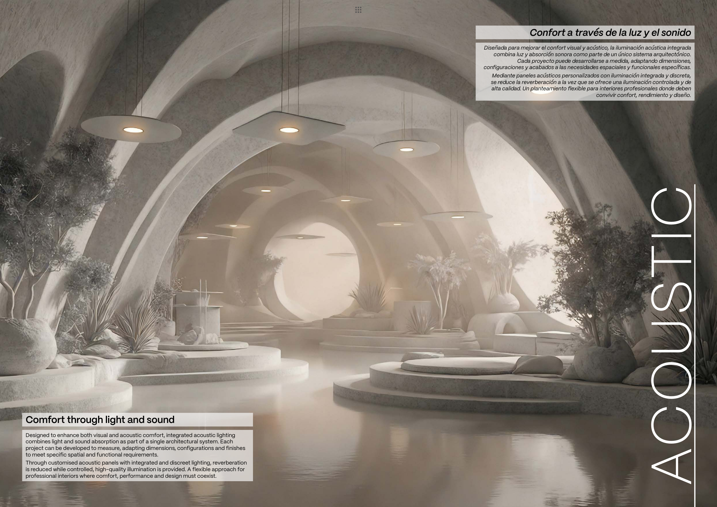 Through customised acoustic panels with integrated and discreet lighting, reverberation