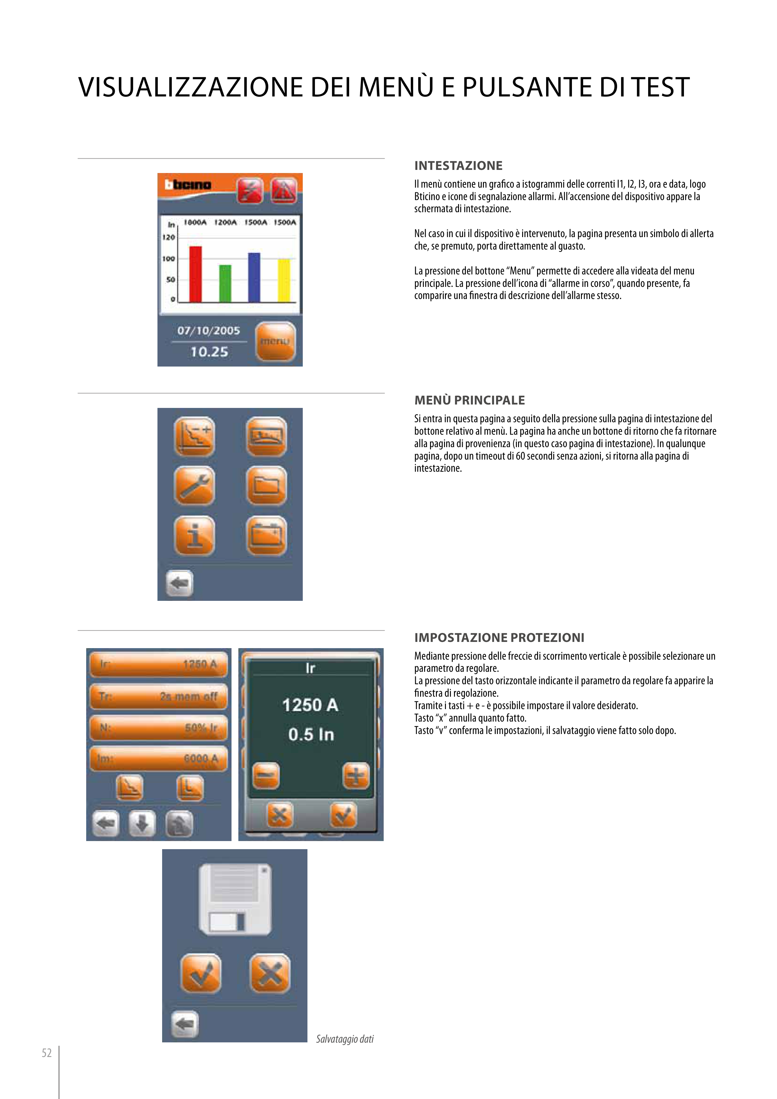 Il menù contiene un grafico a istogrammi delle correnti I1, I2, I3, ora e data, logo