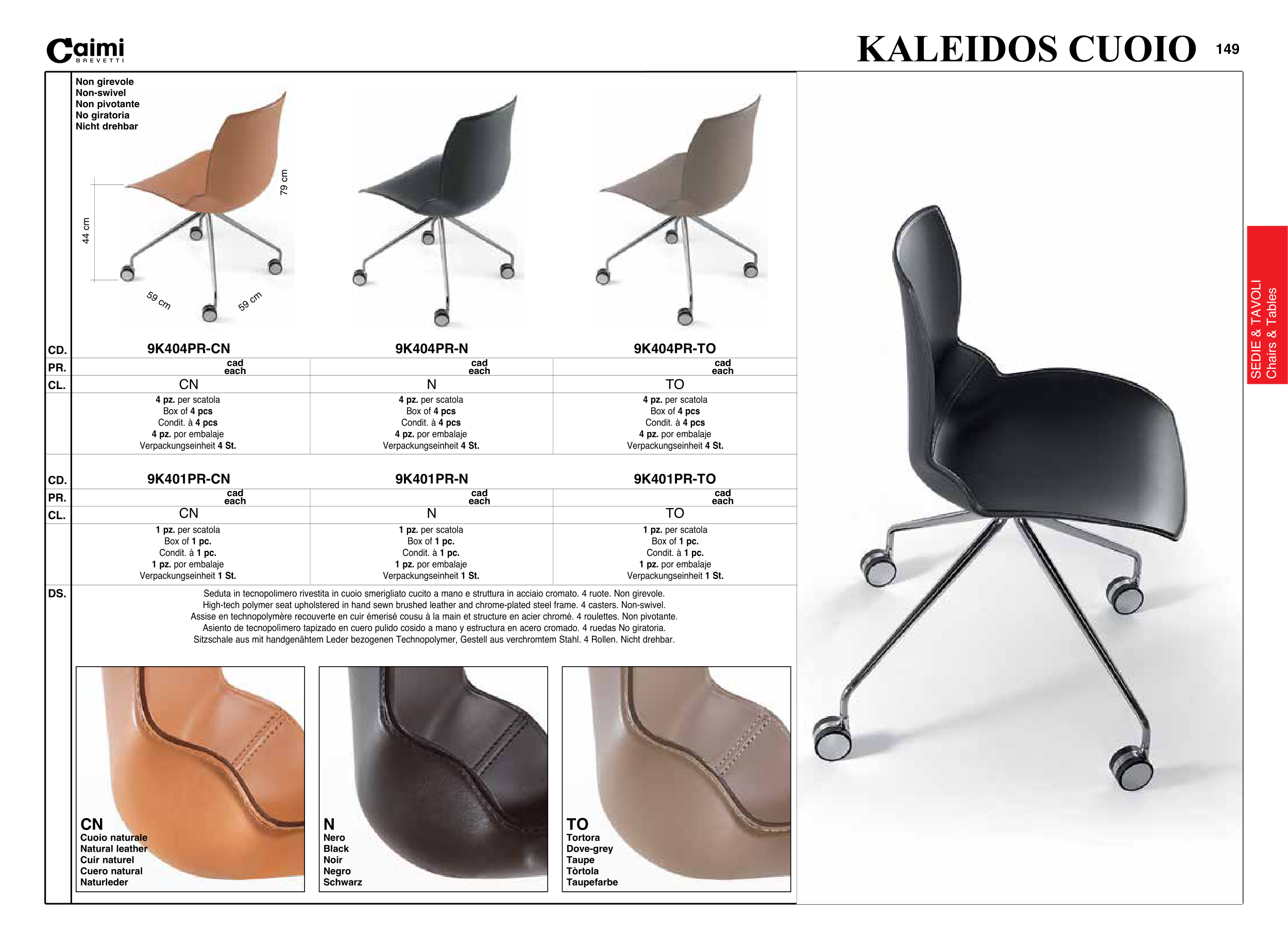 Asiento de tecnopolìmero tapizado en cuero pulido cosido a mano y estructura en acero cromado. 4 ruedas No giratoria.