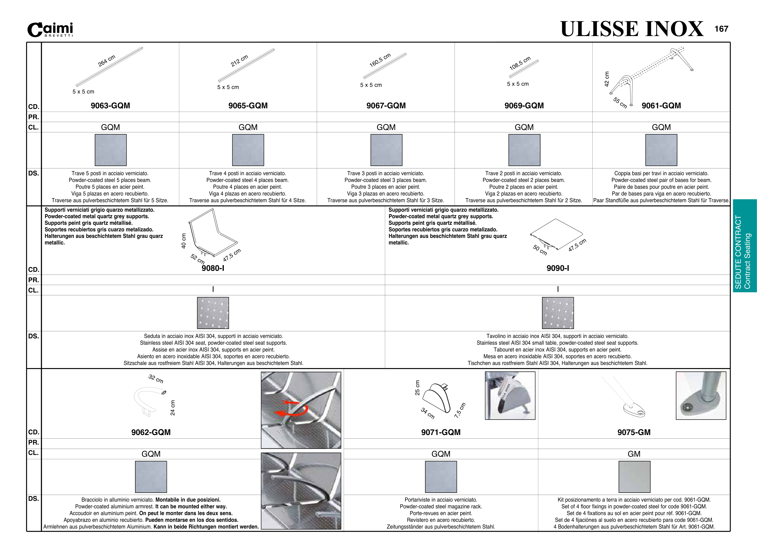 Seduta in acciaio inox AISI 304, supporti in acciaio verniciato.